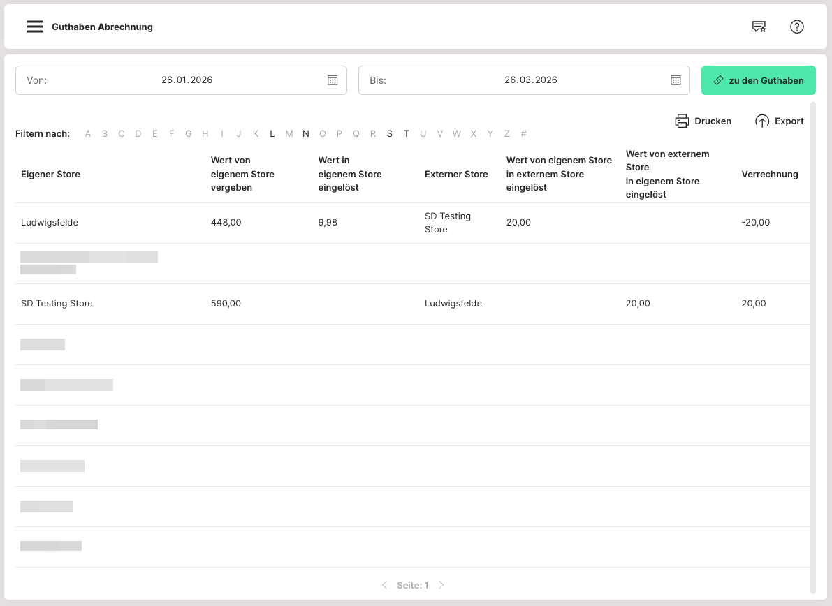 Eigene Guthaben eingelöst im fremden Store | Im eigenen Store verkaufte Guthaben, die in einem fremden Store eingelöst wurden. |