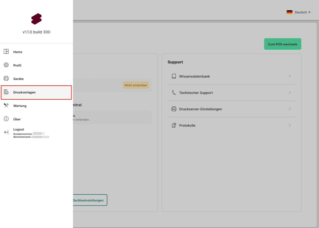 Restaurant POS App: Menü > Druckvorlagen. |