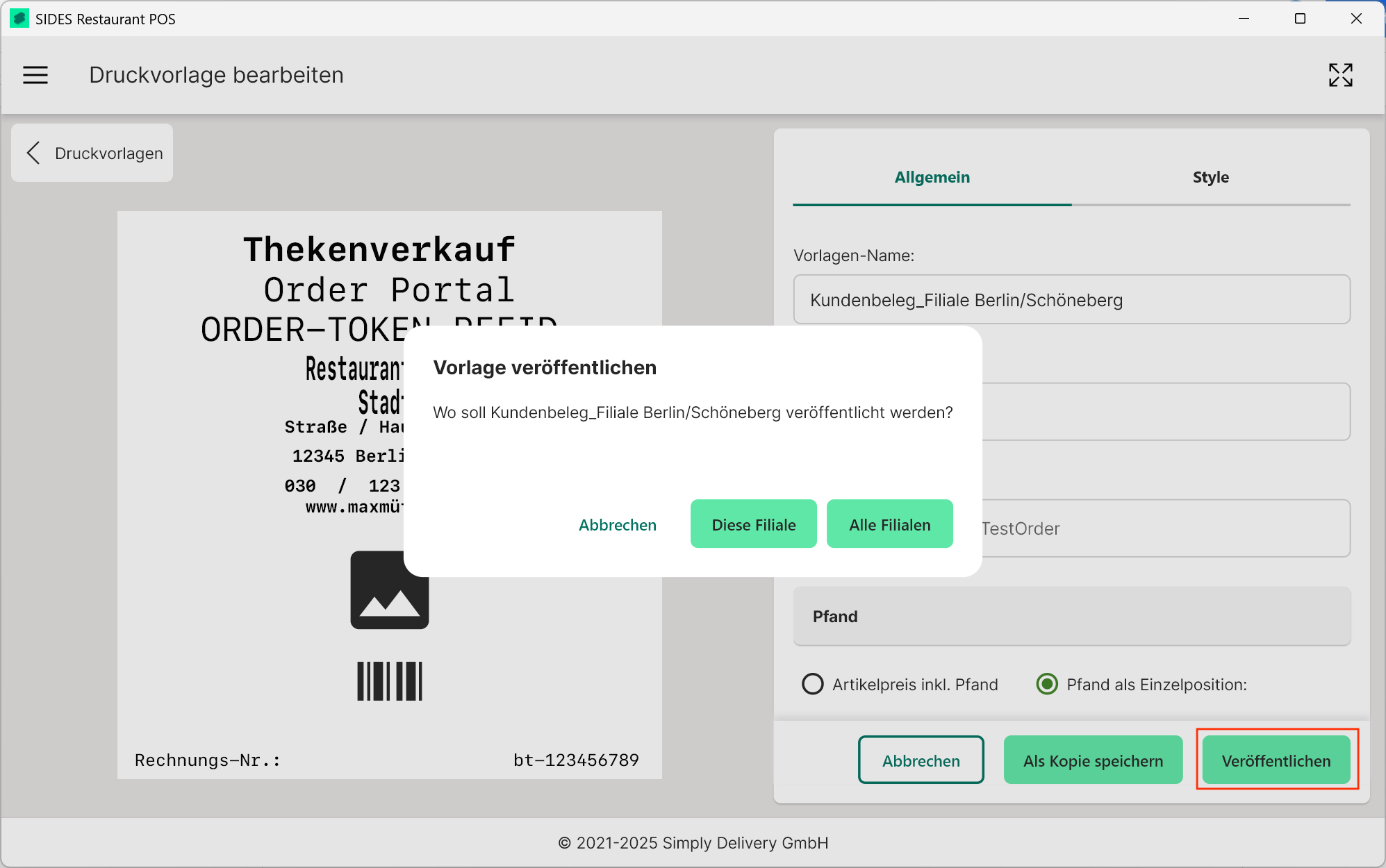 Nach dem Speichern einer Druckvorlage in der Restaurant POS App, ändert sich der Button zu "Veröffentlichen".