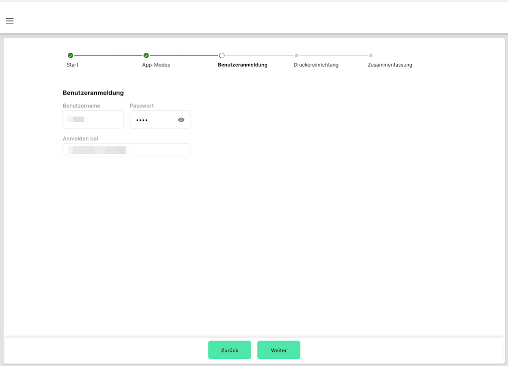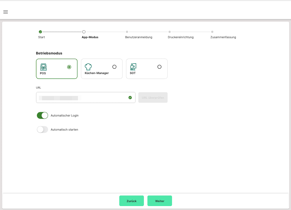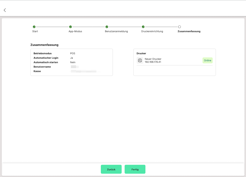 Einrichtungsassistent der POS App unterstützt dich Schritt für Schritt bei der grundlegenden Konfiguration, von der Sprachauswahl bis zur