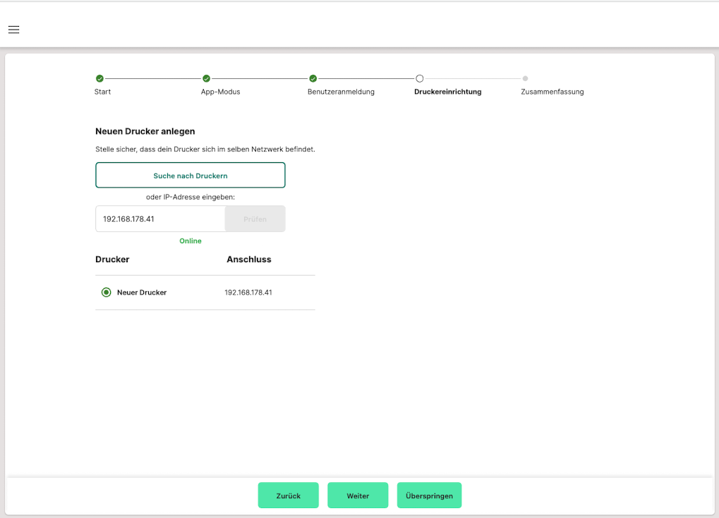 Oder: Gib die IP-Adresse deines Druckers ein und klicke auf "Prüfen". - Sobald der Drucker als "Online" angezeigt wird, kannst du ihn auswählen.