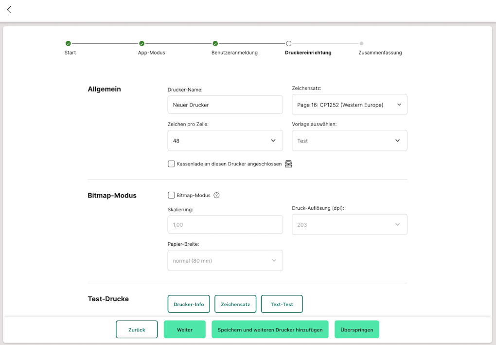 In der Druckerübersicht wird dieser Drucker zusätzlich mit einem Kassensymbol gekennzeichnet. - Optional: Aktiviere den "Bitmap-Modus" (wenn du nicht unterstützte Zeichen als Bitmap drucken möchtest) und passe Skalierung/Papierbreite an.