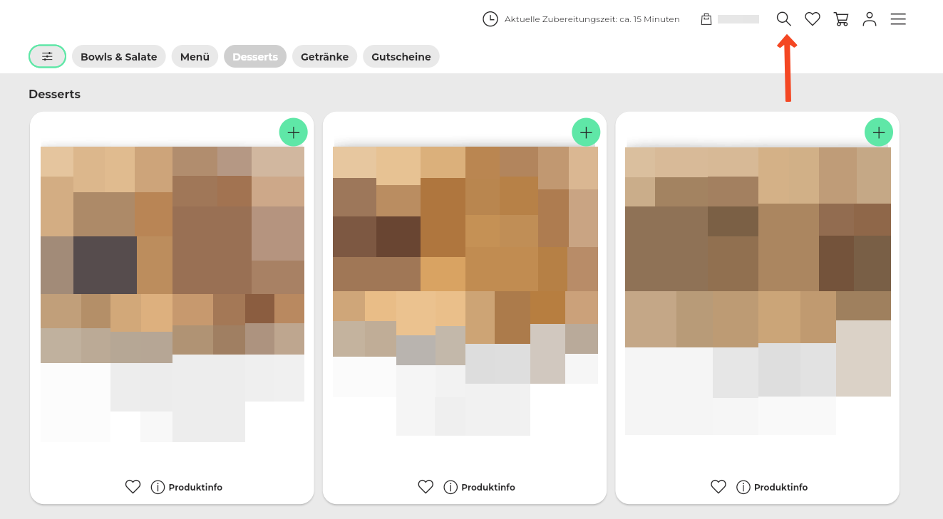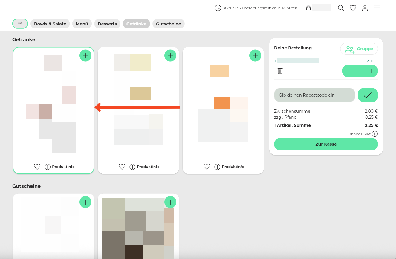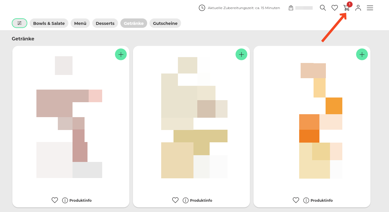 50. Beispiel Artikelansicht: 1 große, 2 kleine Kacheln + Kennzeichnung der bereits vorhandenen Artikel im Warenkorb.