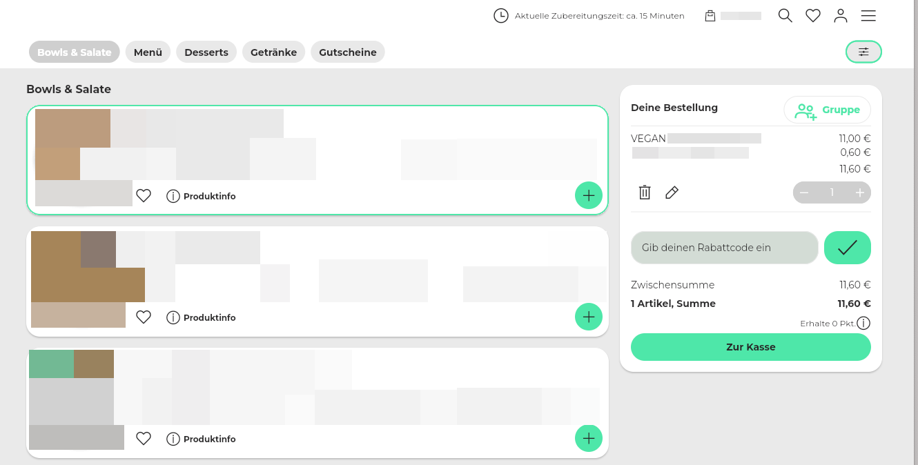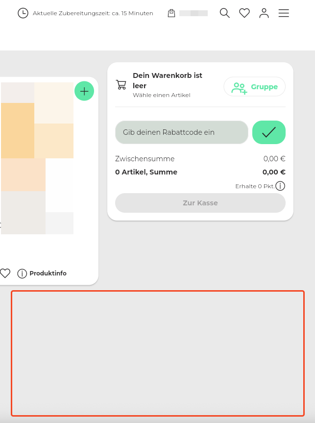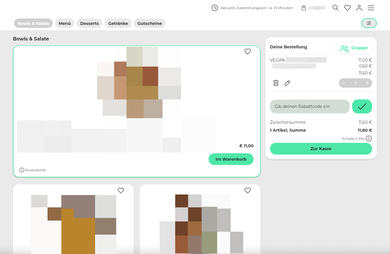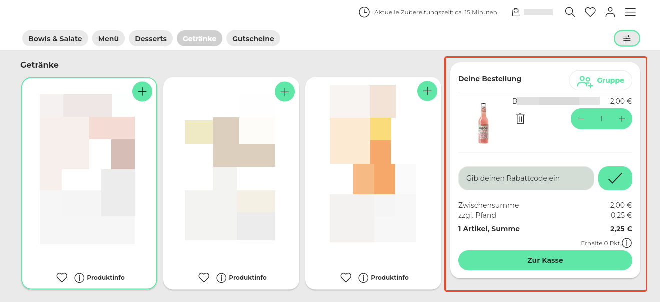 50. Beispiel Artikelansicht: 1 große, 2 kleine Kacheln + Kennzeichnung der bereits vorhandenen Artikel im Warenkorb.