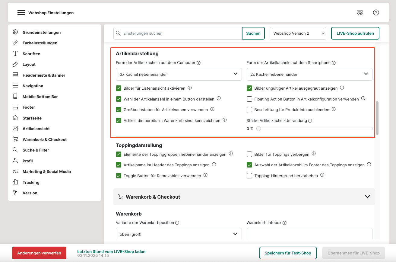 47. Es gibt drei Möglichkeiten unter "Artikeldarstellung", wie deine Artikel angezeigt werden können (3x Kachel nebeneinander, Listenansicht und 1 große, 2 kleine Kachel). Für den mobilen Webshop kann eine andere Ansicht eingestellt werden, wenn man dies möchte.