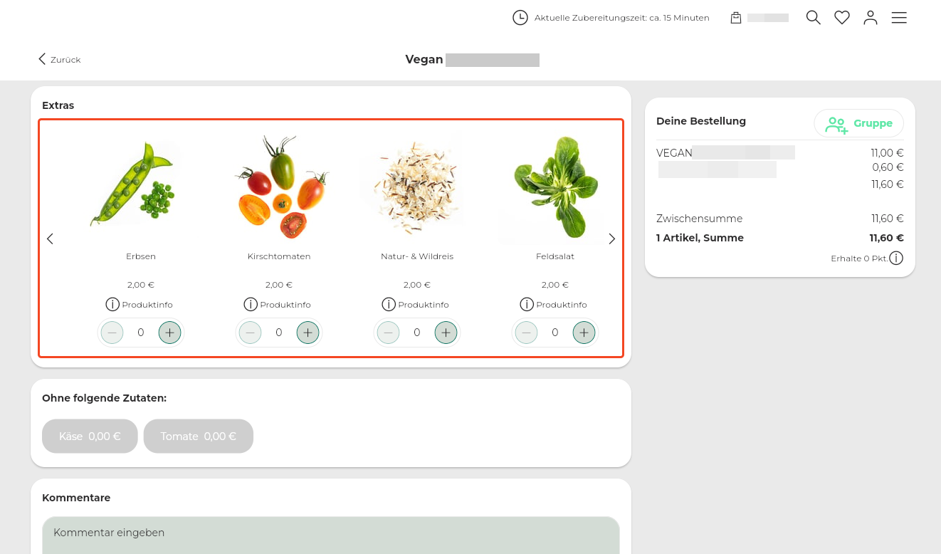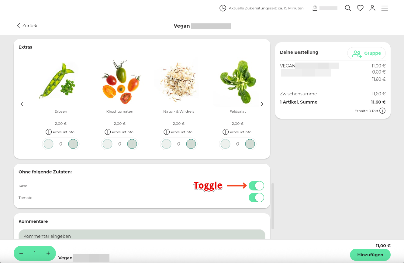 53. Beispiel Toppingdarstellung: Artikelname im Header des Toppings anzeigen + Toggle-Button für Removables (abwählbare Artikel) verwenden + Auswahl der Artikelanzahl im Footer des Toppings anzeigen.