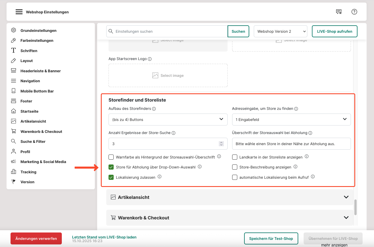 43. Die Einstellungen unter "Storefinder und Storeliste" dienen der Vereinfachung des Endkunden bei der Adresseingabe. Damit der Kunde bei einer Abholung z. B. nicht die Adresse oder Postleitzahl eingeben muss, kann dies über eine feste Hinterlegung der Store-Adressen über ein Drop-down-Menü (Auswahlliste) vereinfacht werden.