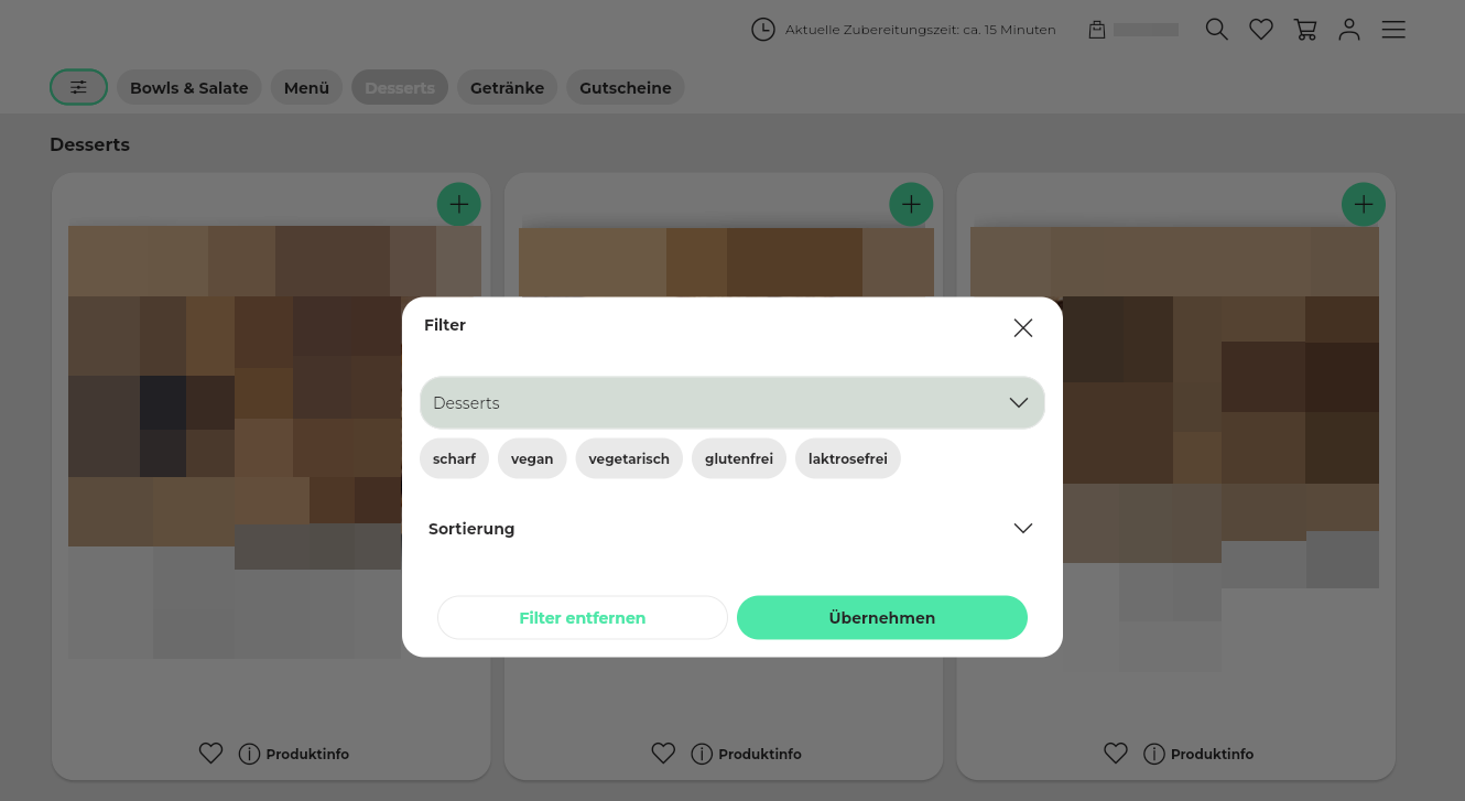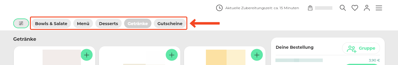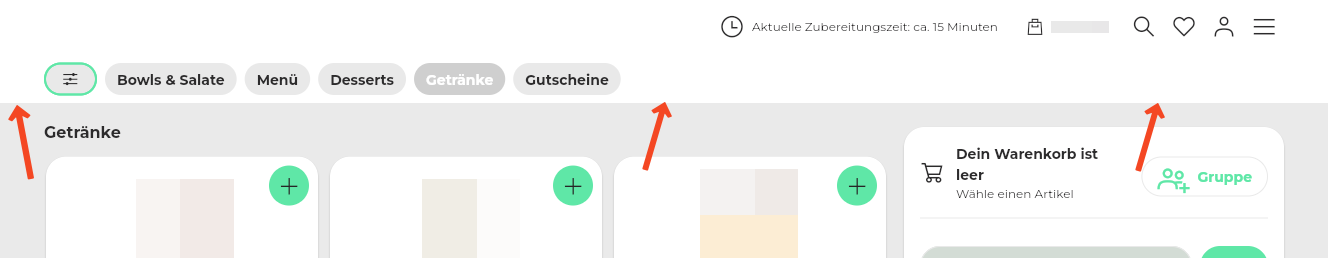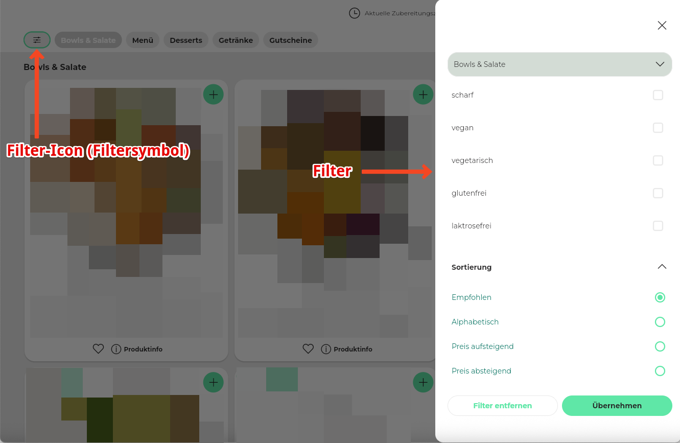58. Wenn du Artikel mit Artikeltags (Artikelfilter) versehen hast, haben die Kunden über die "Filter" die Möglichkeit, sich z. B. nur vegetarische Artikel anzeigen zu lassen (wenn die Artikeleinstellungen korrekt sind). Die Filterfunktion kann auch ausgeblendet werden. Stelle hierzu die Position des Filter-Icons (Filtersymbol) im Drop-down-Menü auf "Filter-Icon ausblenden".