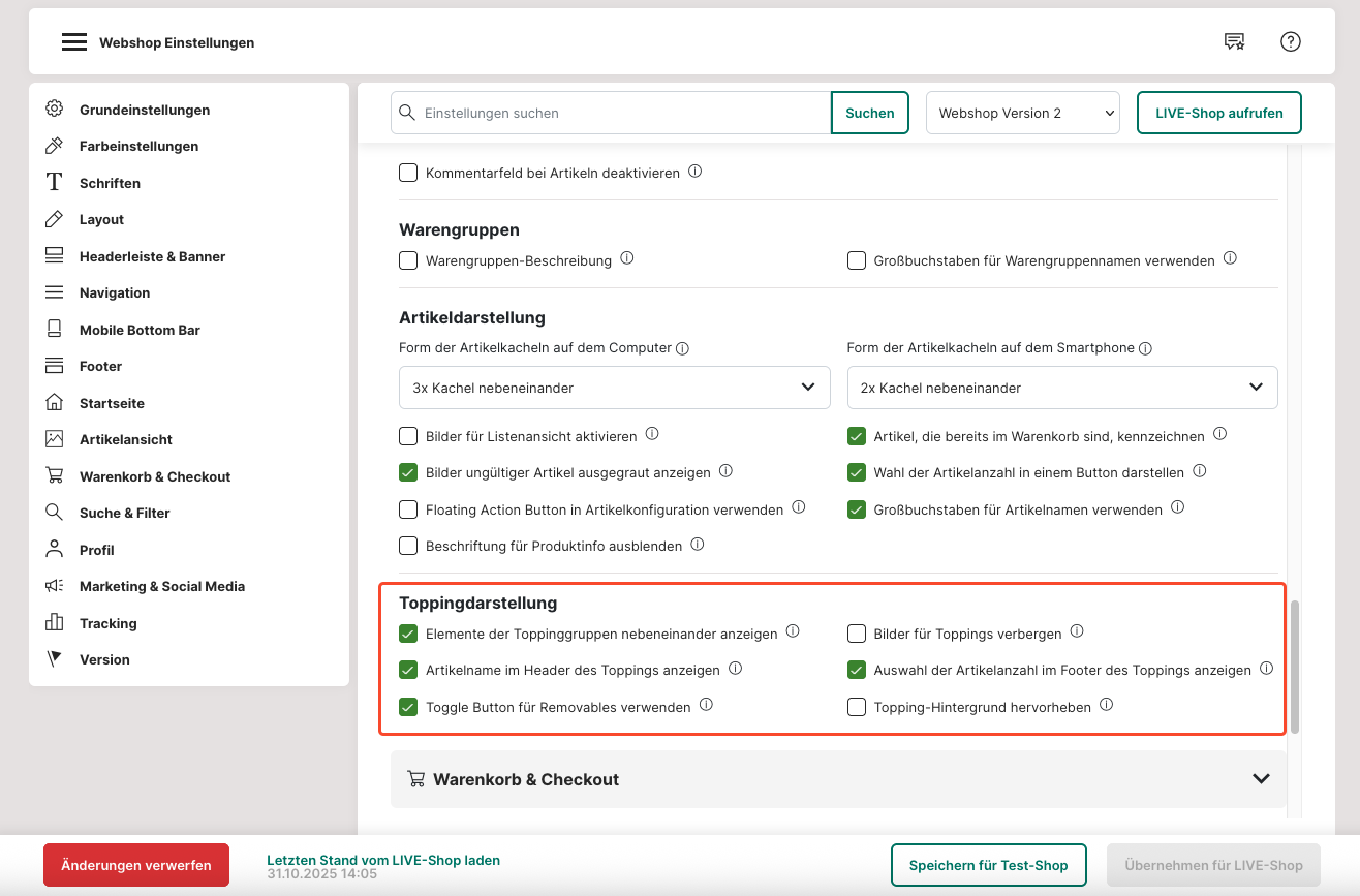 51. Du hast die Möglichkeit unter "Toppingdarstellung", deine Toppings in verschiedenen Weisen darzustellen, mit Bildern, nebeneinander, etc. Wenn du den Toppings Bilder hinzugefügt hast, werden diese auch angezeigt, können aber mit dem richtigen Haken deaktiviert werden.