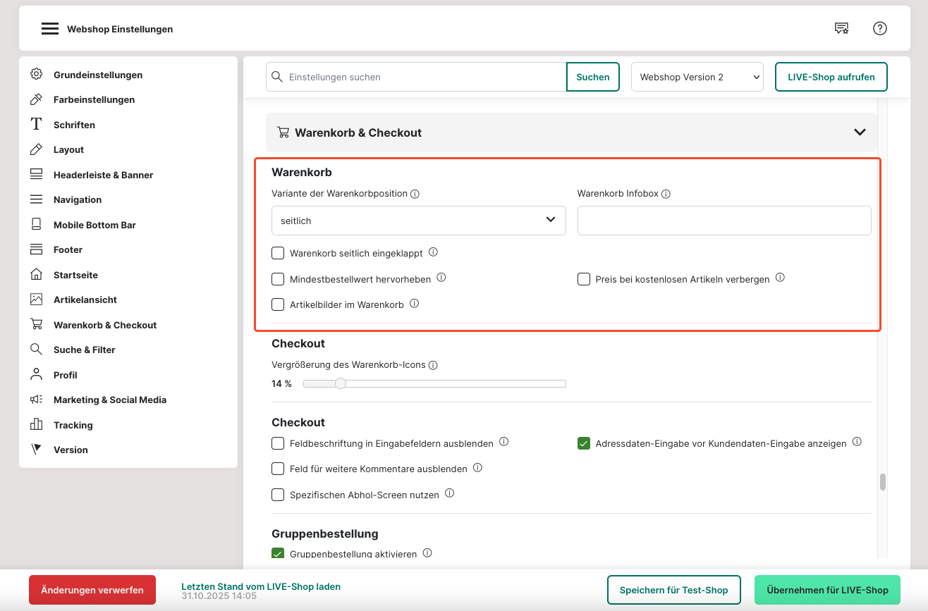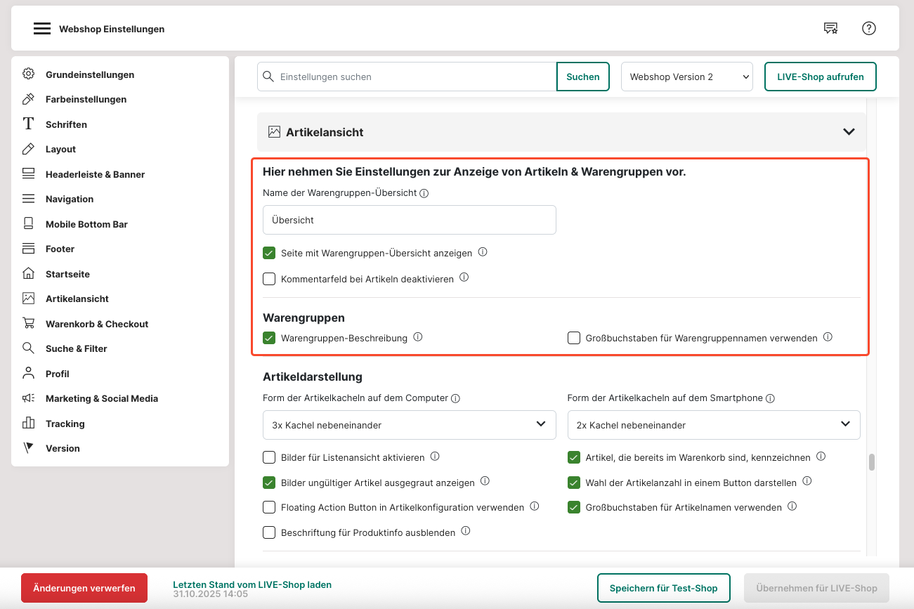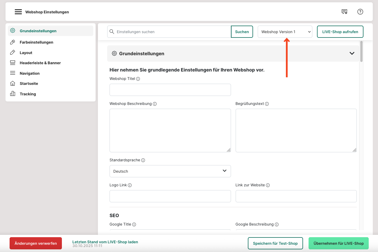 3. Ändere die Einstellungen von "Webshop Version 1" zu "Webshop Version 2".