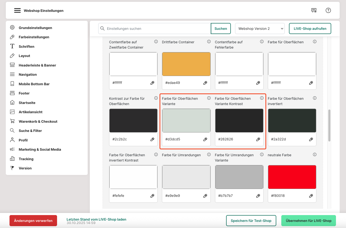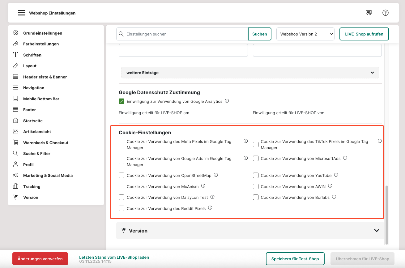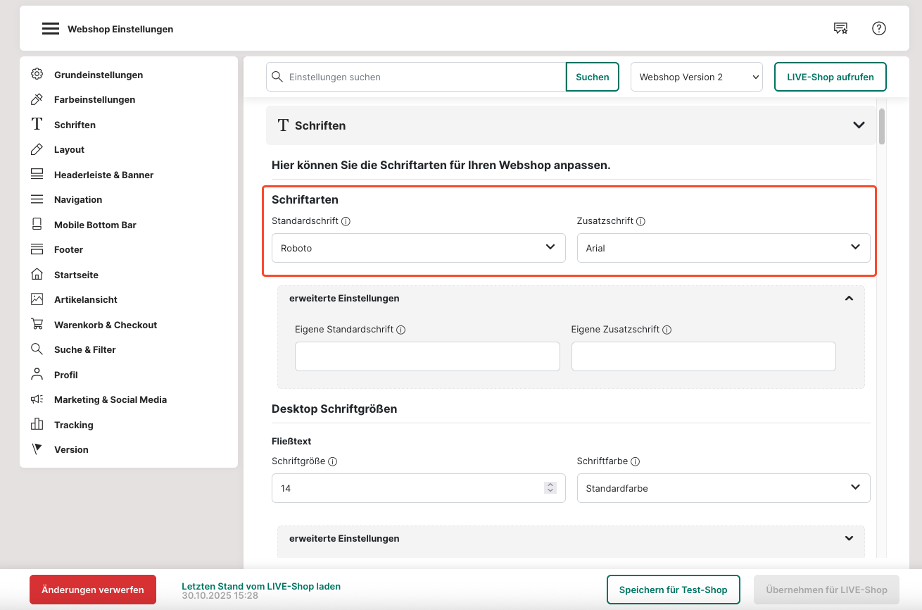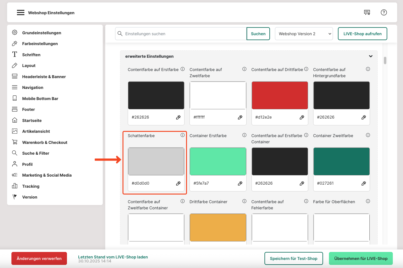 3. Ändere die Einstellungen von "Webshop Version 1" zu "Webshop Version 2".