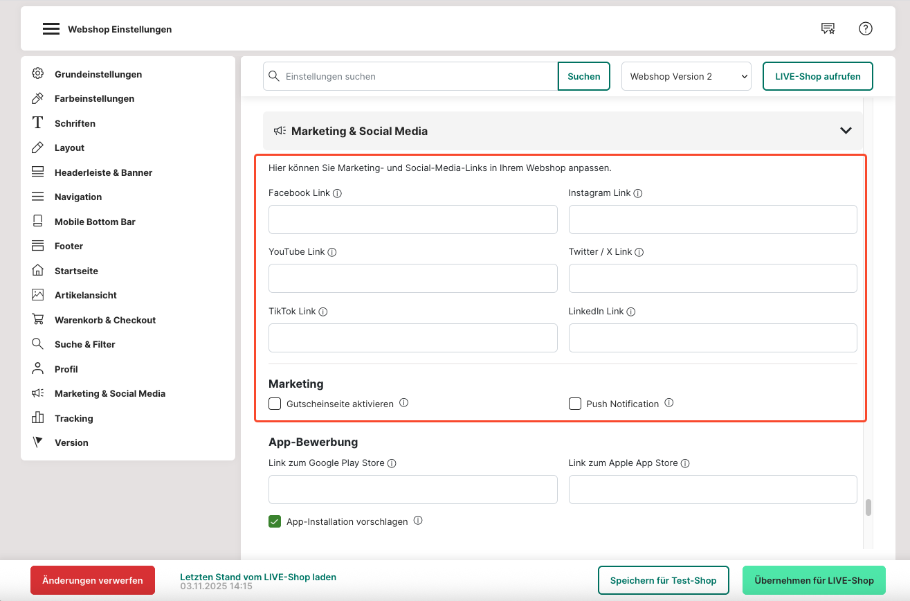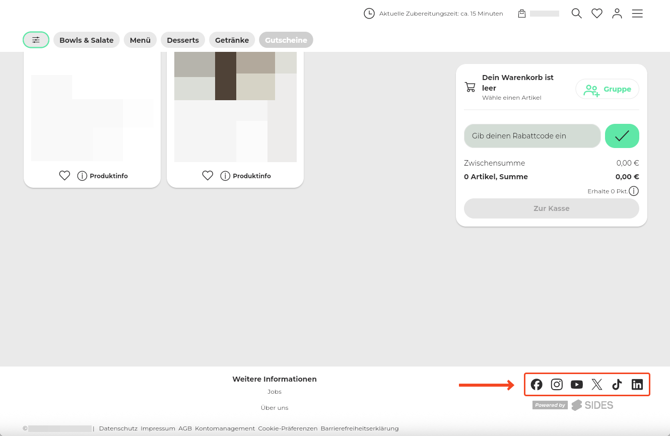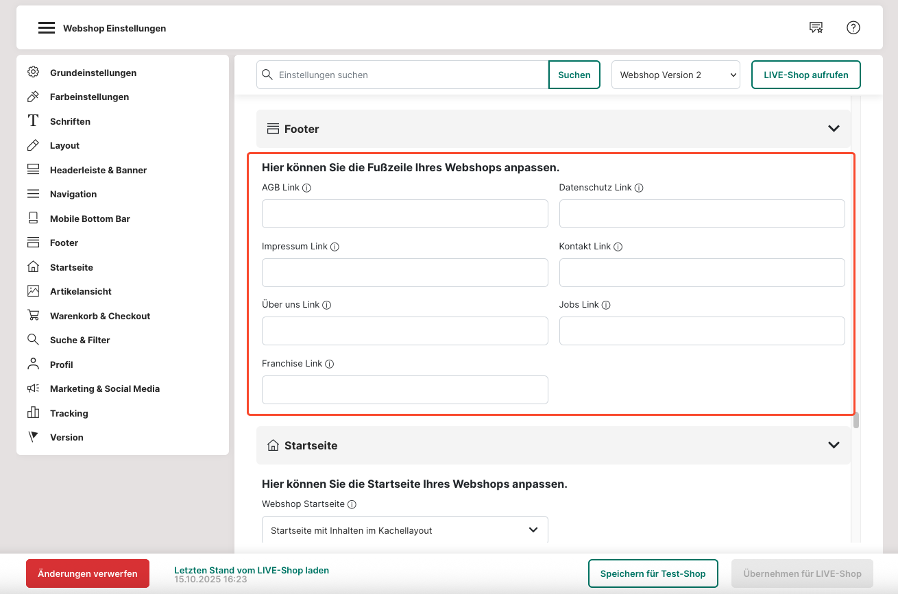 64. Um eine größere Reichweite zu erzielen, kannst du deine Social Media Seiten im Footer (Fußzeile) verlinken. Pflege hierzu die URL deiner Seiten in das entsprechende Feld ein.