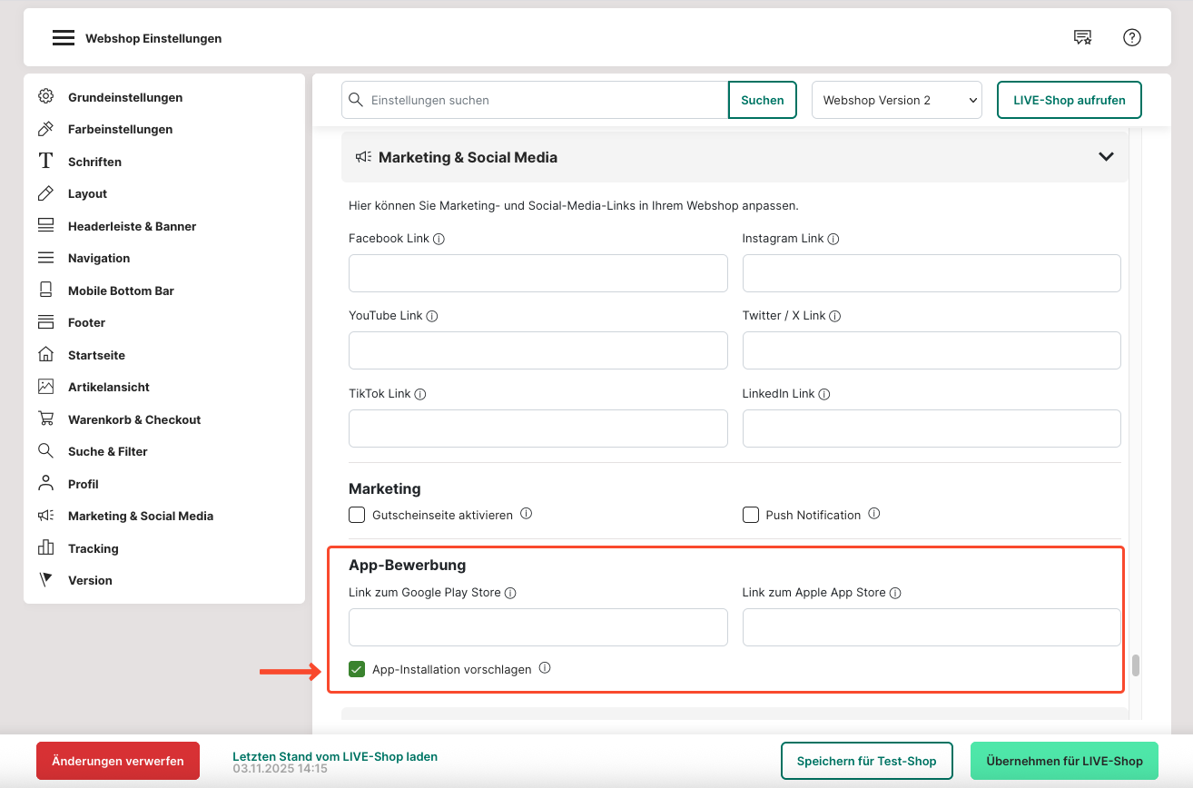 Soll die Installation der App vorgeschlagen werden, sobald man deinen Webshop besucht, hake das Kästchen "App-Installation vorschlagen" an.