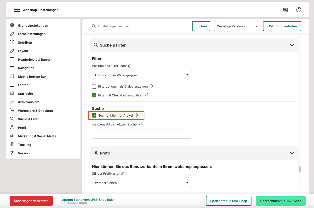 61. Damit die Kunden in deinem Webshop nach Artikeln suchen können, aktiviere die Funktion über das Häkchen "Suchfunktion für Artikel". Die Suchfunktion taucht dann oben im Header (Kopfzeile) auf.