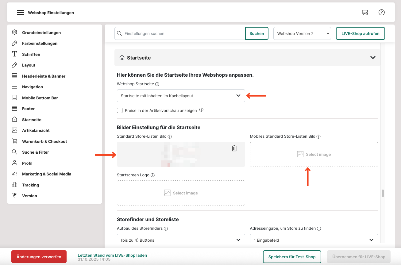 41. Unter dem Punkt "Startseite", kannst du Bilder hinterlegen, die auf der Startseite angezeigt werden. Bitte bedenke, dass für den mobilen Webshop ein anderes Format benötigt wird.
