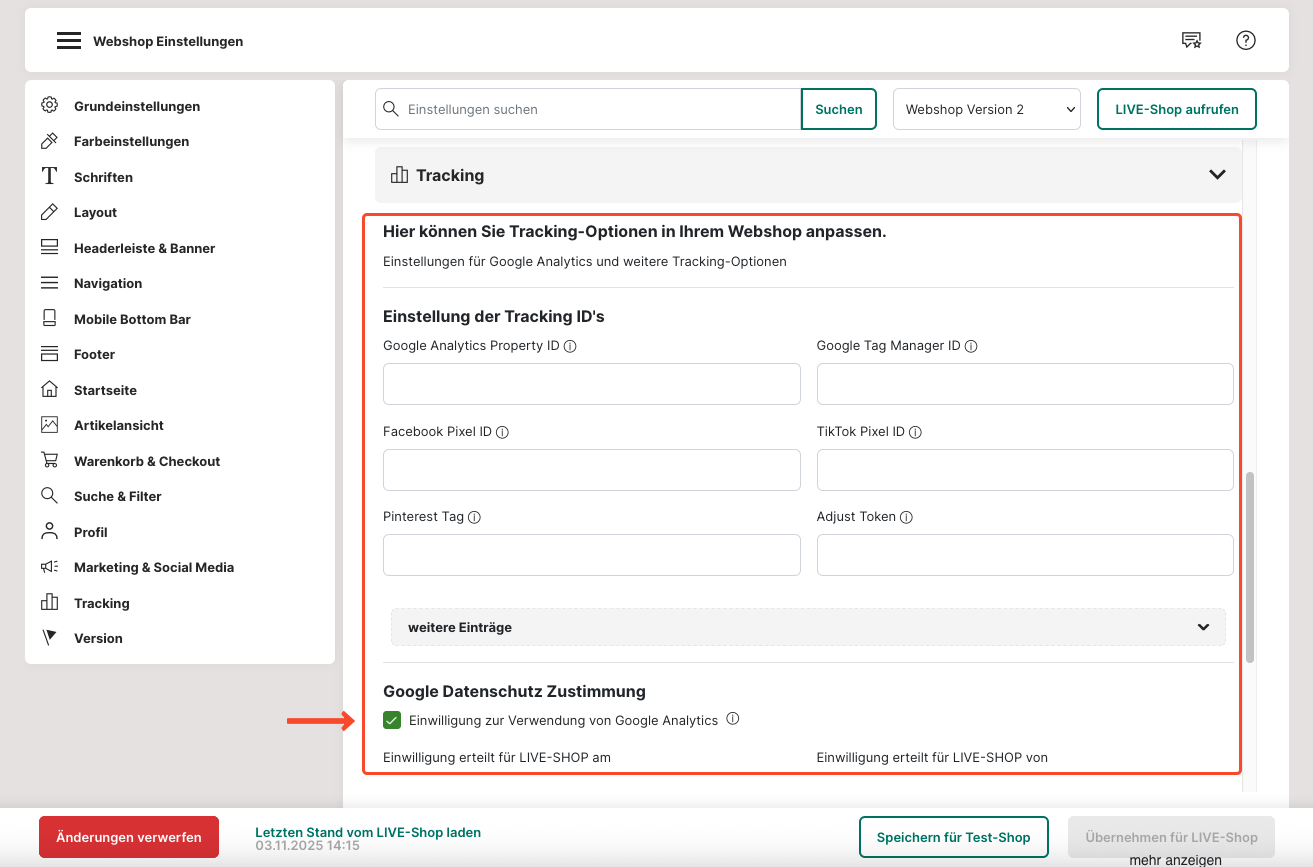 67. Zum Tracken der Nutzung des Webshops, kannst du hier die verschiedenen Tag-IDs eintragen. Beachte, dass du für die Nutzung von Google-Tags, das Häkchen für die Einwilligung der Nutzung von Google Analytics aktivierst.