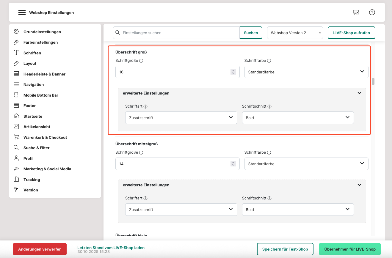 25. Für alle "Überschriften"-Größen kannst du wählen, ob die "Standardschriftart" oder "Zusatzschriftart" verwendet werden soll, auch ob sie "bold" oder "regular" sein soll.