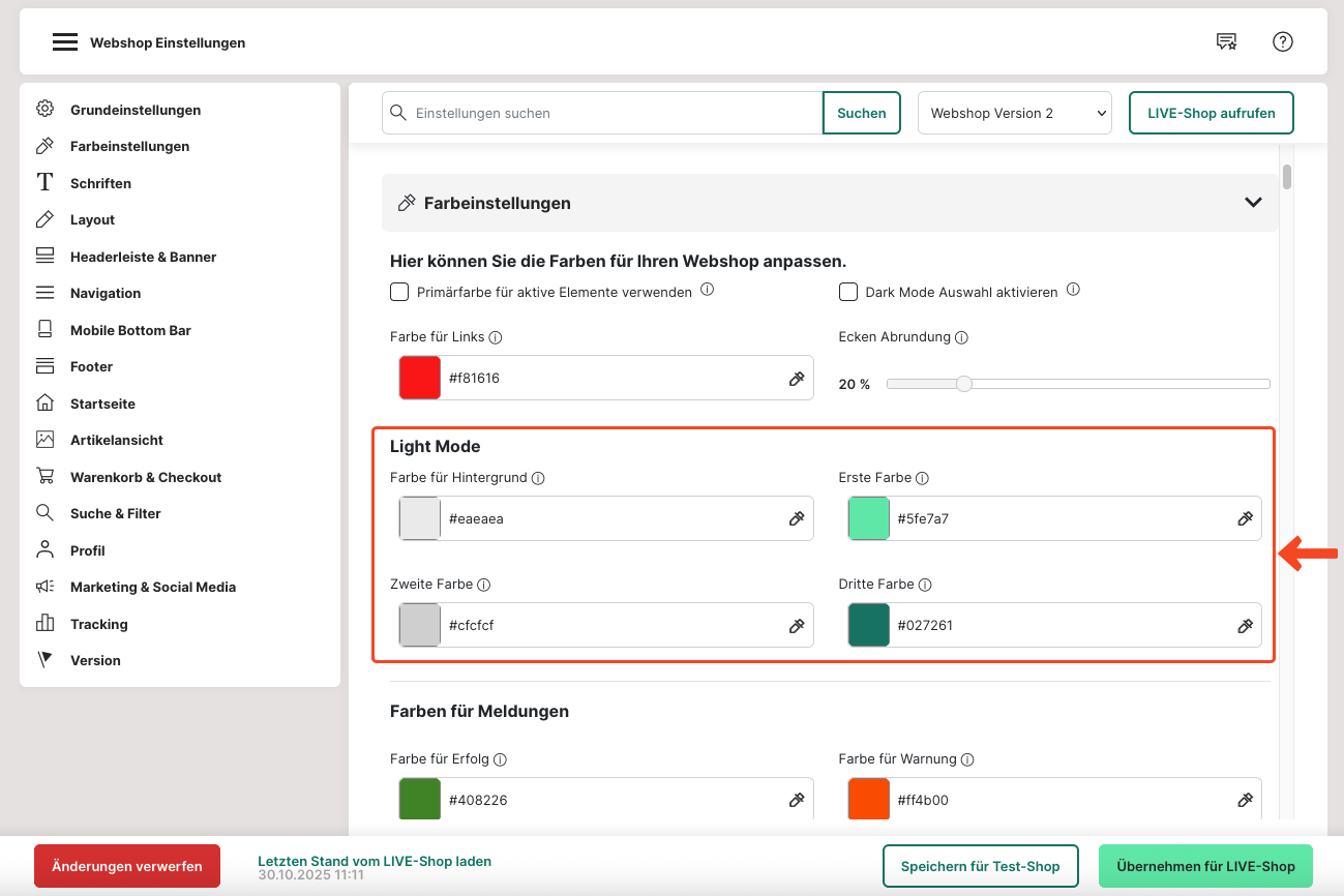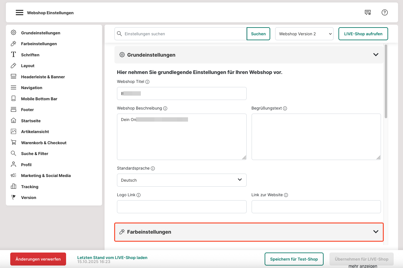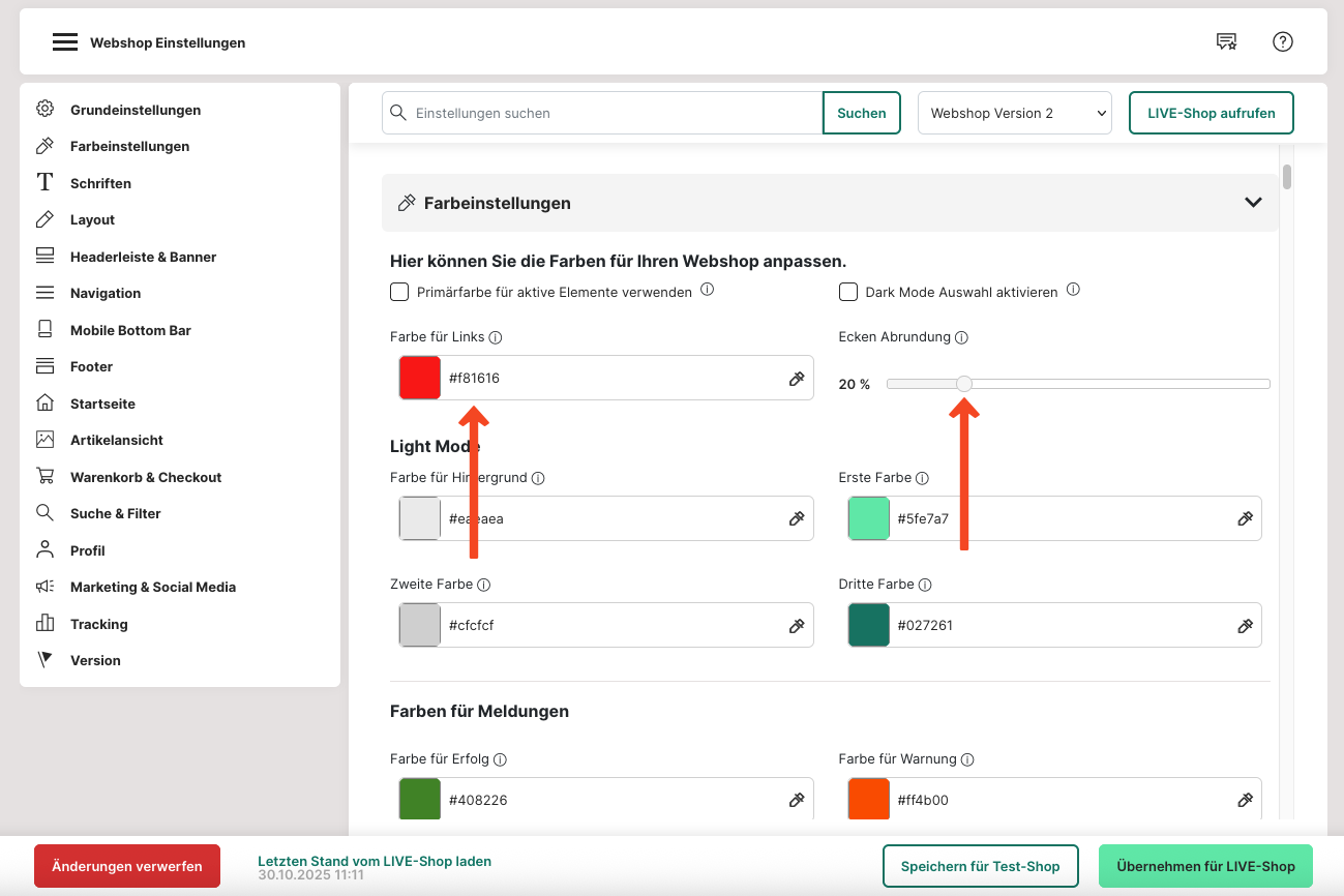9. Unter "Farbe für Links" kannst du eine Farbe deiner Wahl für Verlinkungen in deinem Webshop einstellen.