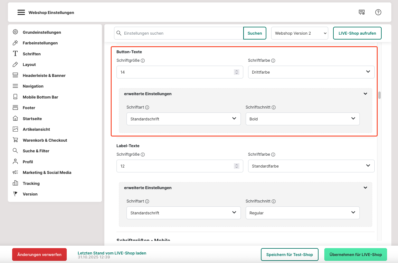 29. Die Einstellungen müssen unter "Schriftgrößen- Mobile" für die "Mobile Version" separat noch einmal eingestellt und angepasst werden.