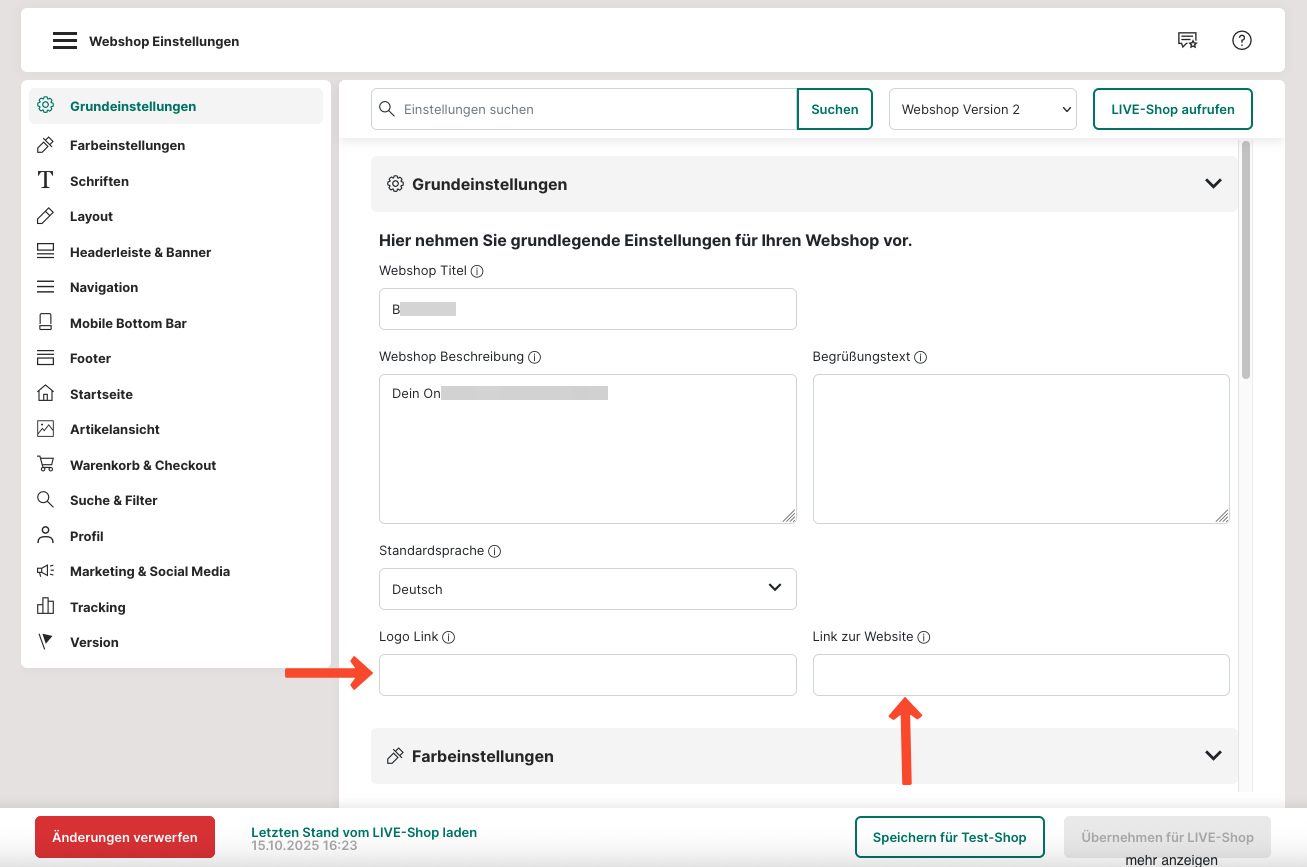 7. Unter "Logo-Link" kannst du einen Link hinter dein Logo im Webshop hinterlegen, wenn man auf eine bestimmte Seite weitergeleitet werden soll, sobald man auf dein Logo klickt.