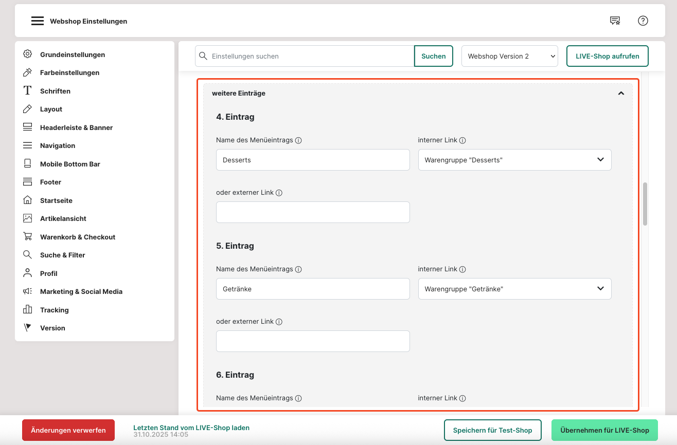 36. Wenn du auf "weitere Einträge" klickst, kannst du weitere Punkte für dein Seitenmenü (max. 12) hinterlegen und einstellen.
