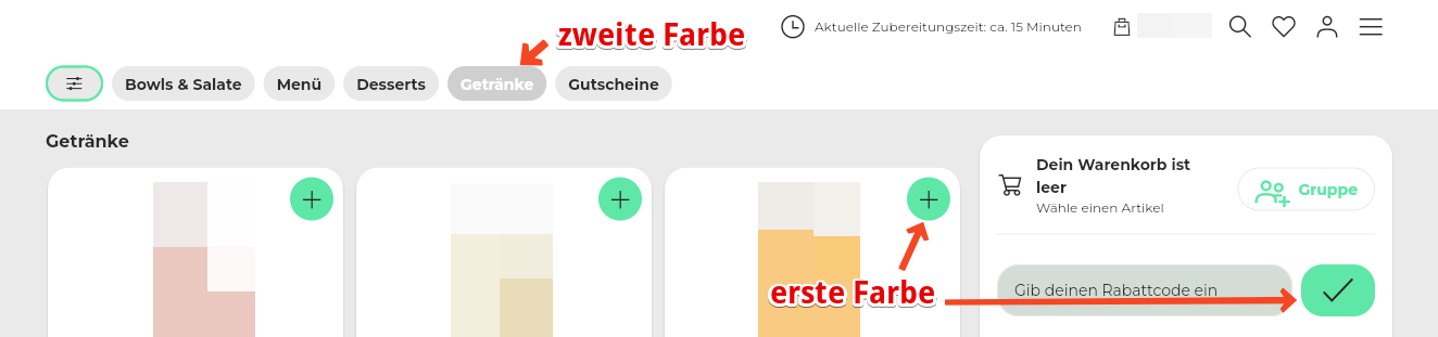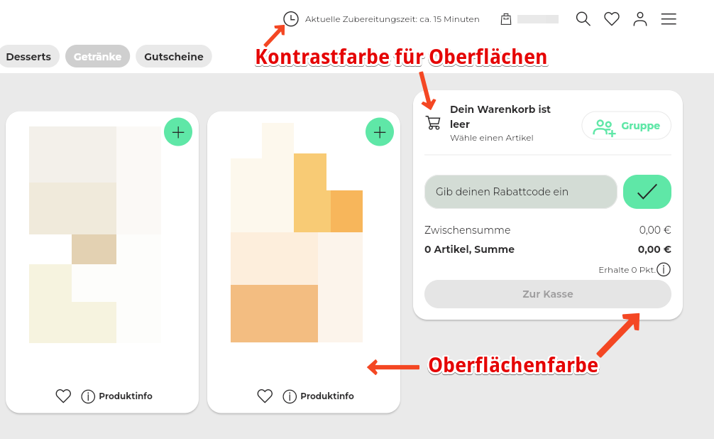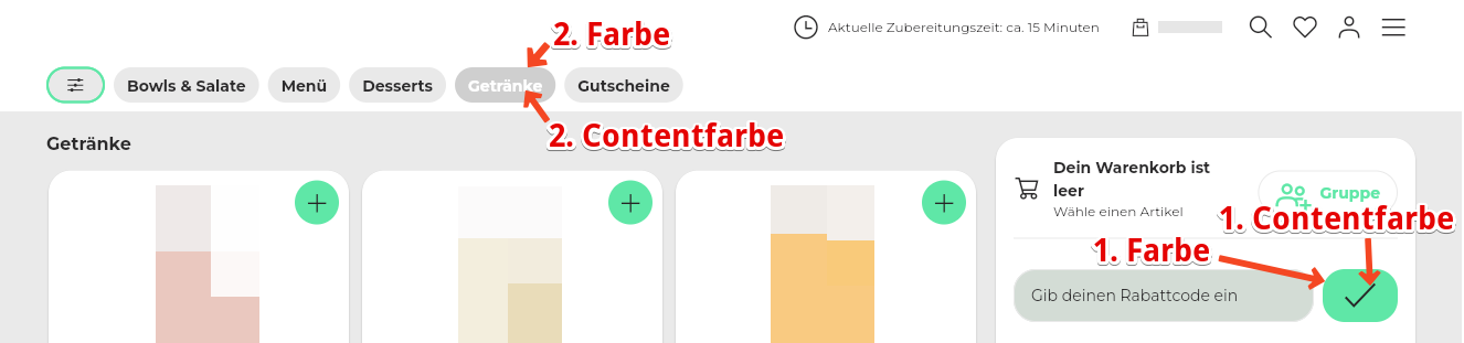 14. Die Hintergrundfarbe betrifft die Farbe hinter den Kacheln, Kästen und dem Warenkorb.