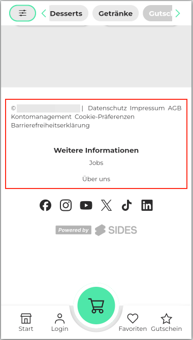 39. Hier können in der Fußzeile (Footer/unterer Bereich) Verlinkungen zu den AGBs, Datenschutz, etc. hinterlegt werden. Dies gilt für den Browser und mobilen Webshop.