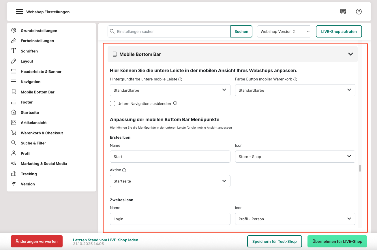 37. Für die "mobile Ansicht" wird hier die "Bottom Bar" (untere Navigationsleiste) angepasst. Du kannst die verschiedenen Icons (Symbole), Funktionen und ihre Reihenfolge selbst auswählen. Es sind ingesamt vier Icons und freie Plätze.