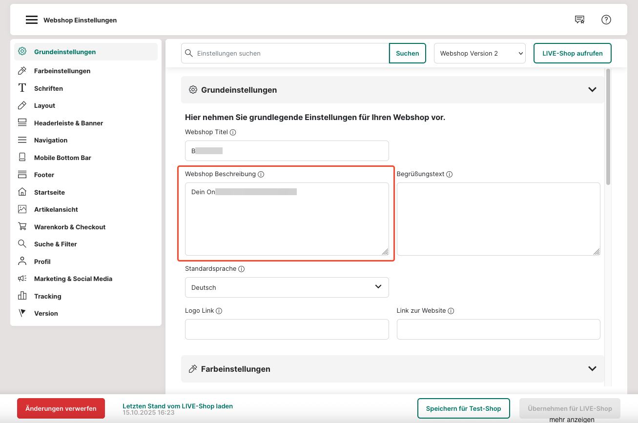6. In dem Feld "Webshop-Beschreibung" kannst du eine Beschreibung für deinen Webshop reinschreiben. Diese wird auch von den verschiedenen Suchmaschinen genutzt, um deinen Webshop vorzuschlagen.