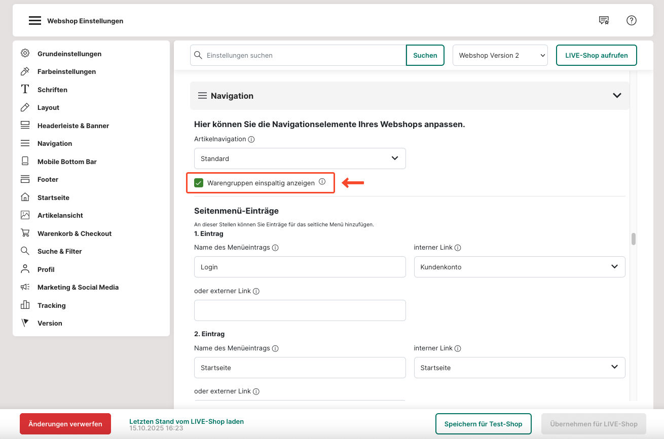 34. Ist das Kästchen für die einspaltigen Warengruppen nicht aktiviert, werden diese im Seitenmenü nebeneinander angezeigt.