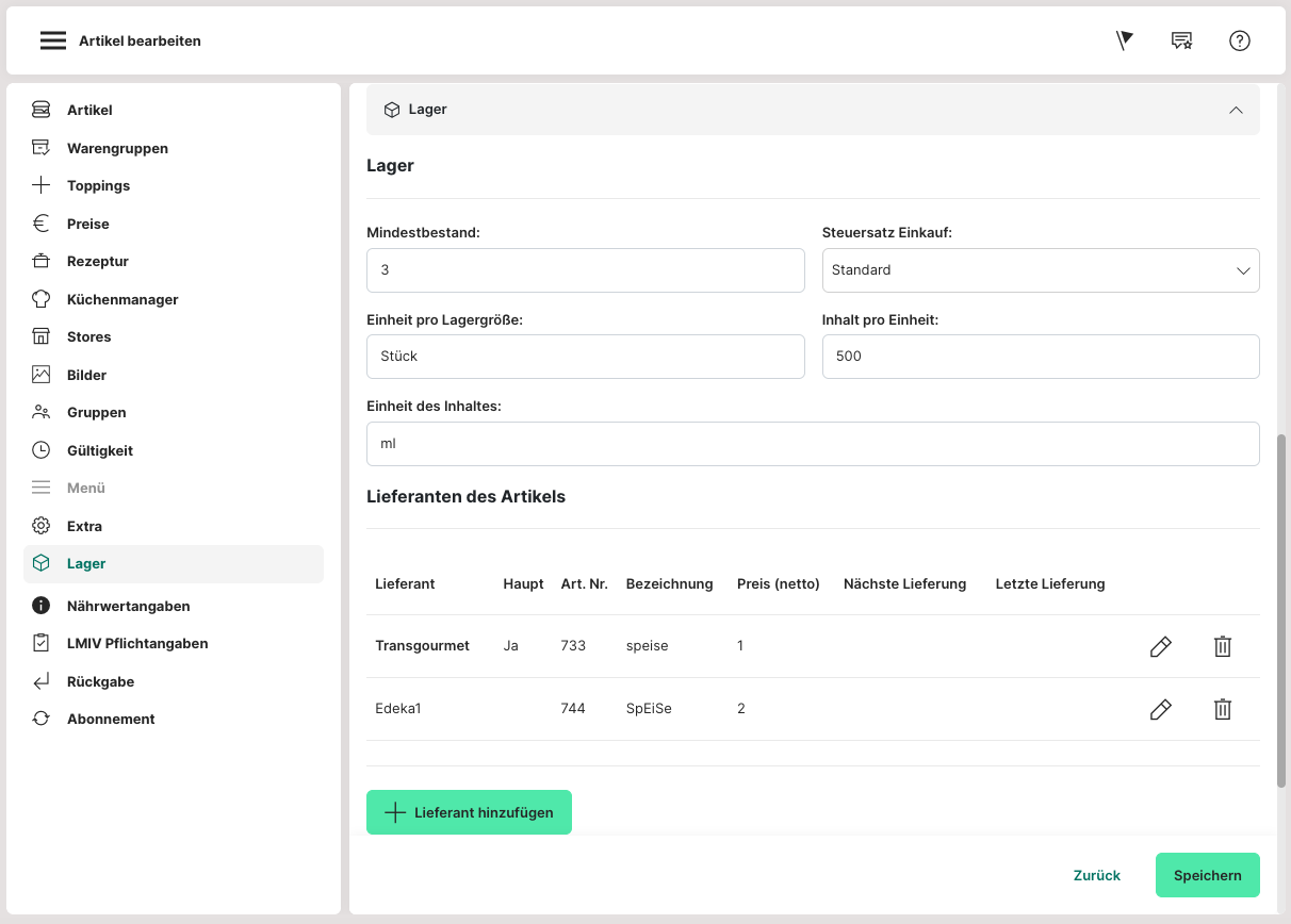 Sofern du die Voreinstellung “Lager aktualisieren” auf der ersten Seite der Artikeleinstellungen bearbeitet hast, kannst du den Reiter “Lager” öffnen und siehst dort die folgende Ansicht.