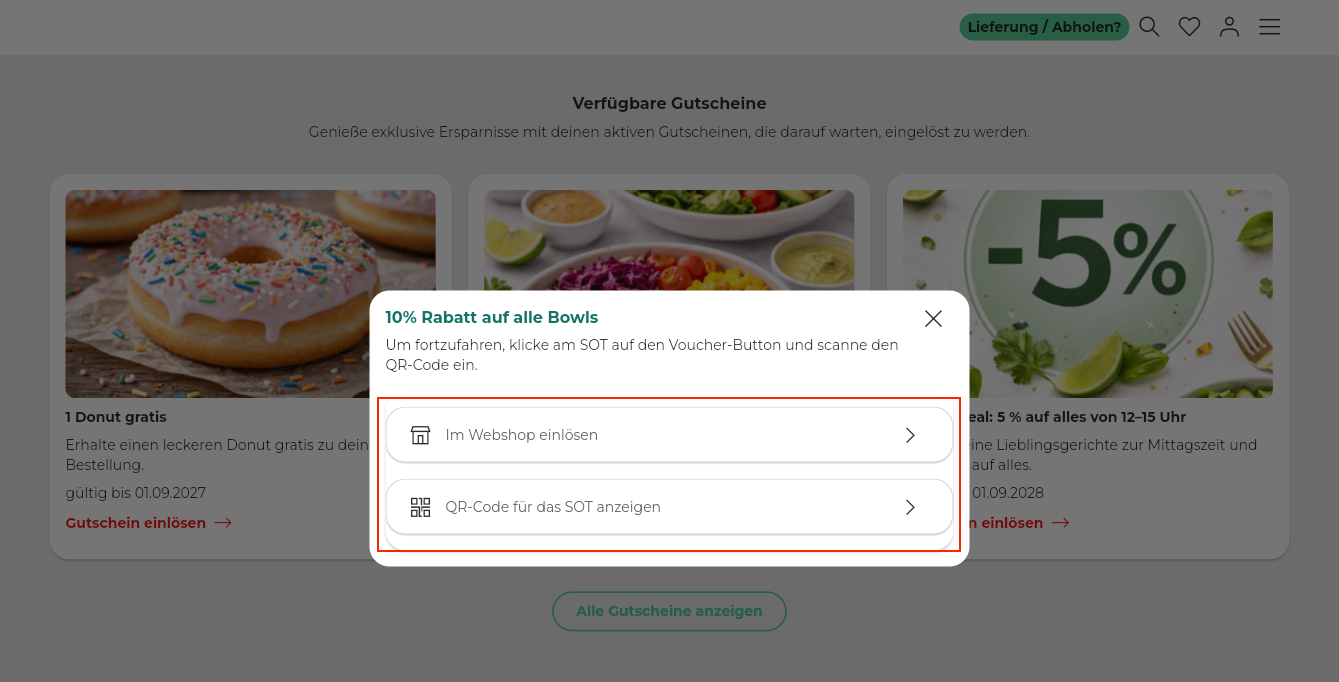 Nach der Auswahl eines Gutscheins kann der Kunde ihn entweder direkt im Webshop einlösen oder, falls ein Self-Ordering-Terminal (SOT) vorhanden ist, einen QR-Code zur Einlösung am Self-Ordering-Terminal anzeigen lassen.
