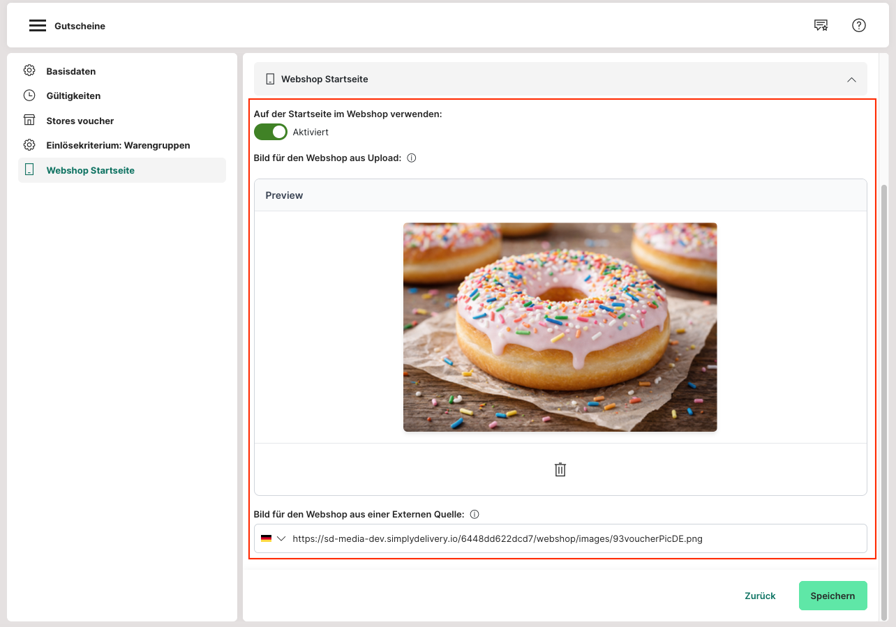 Weitere Informationen zur Gutscheinerstellung sind hier hinterlegt: https://support.get-sides.de/portal/de/kb/articles/gutscheine. - Aktiviere im Abschnitt "Webshop-Startseite" die Option "Auf der Startseite im Webshop verwenden".