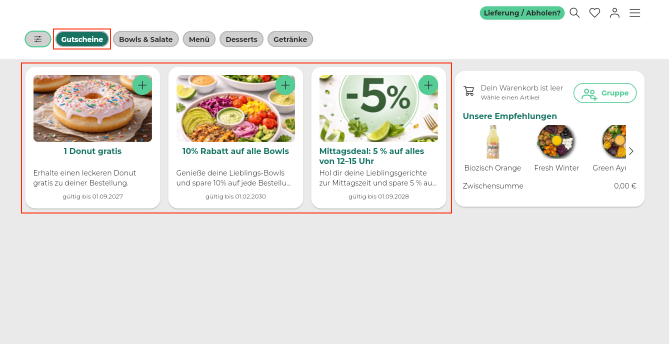 Bei Bedarf kann eine separate Gutscheinseite aktiviert werden, über die Kunden alle Gutscheine einsehen können, die auch auf der Startseite angezeigt werden. So haben sie nach der Auswahl eines Stores direkten Zugriff auf die Gutscheine.
