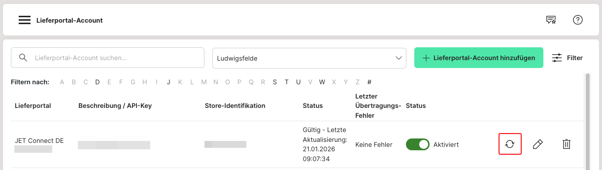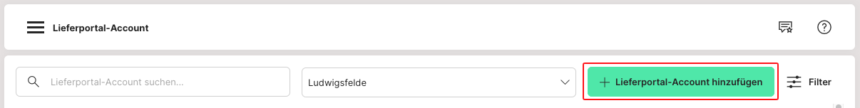 Admin: Externe Dienste > Lieferportal-Accounts > Lieferportal-Account hinzufügen. |