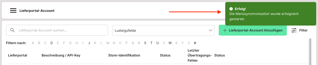 Gehe in der Admin-Navigationsleiste zu Admin: Externe Dienste > Lieferportal-Accounts und wähle das Portal aus, für das du die Speisekartensynchronisierung starten möchtest. Klicke auf die Schaltfläche "Synchronisieren".