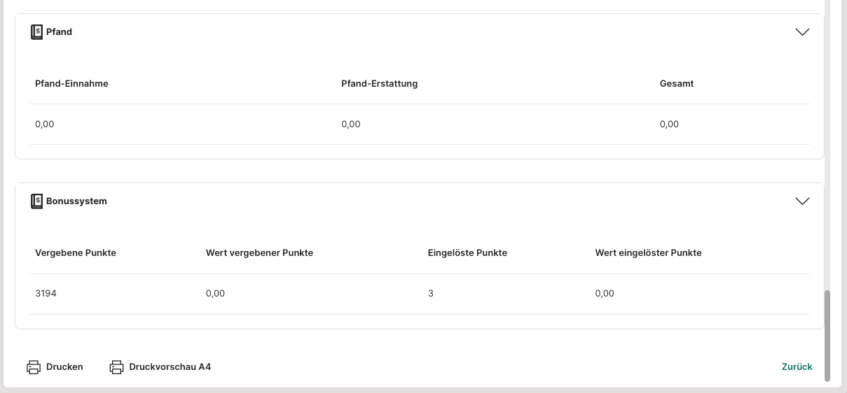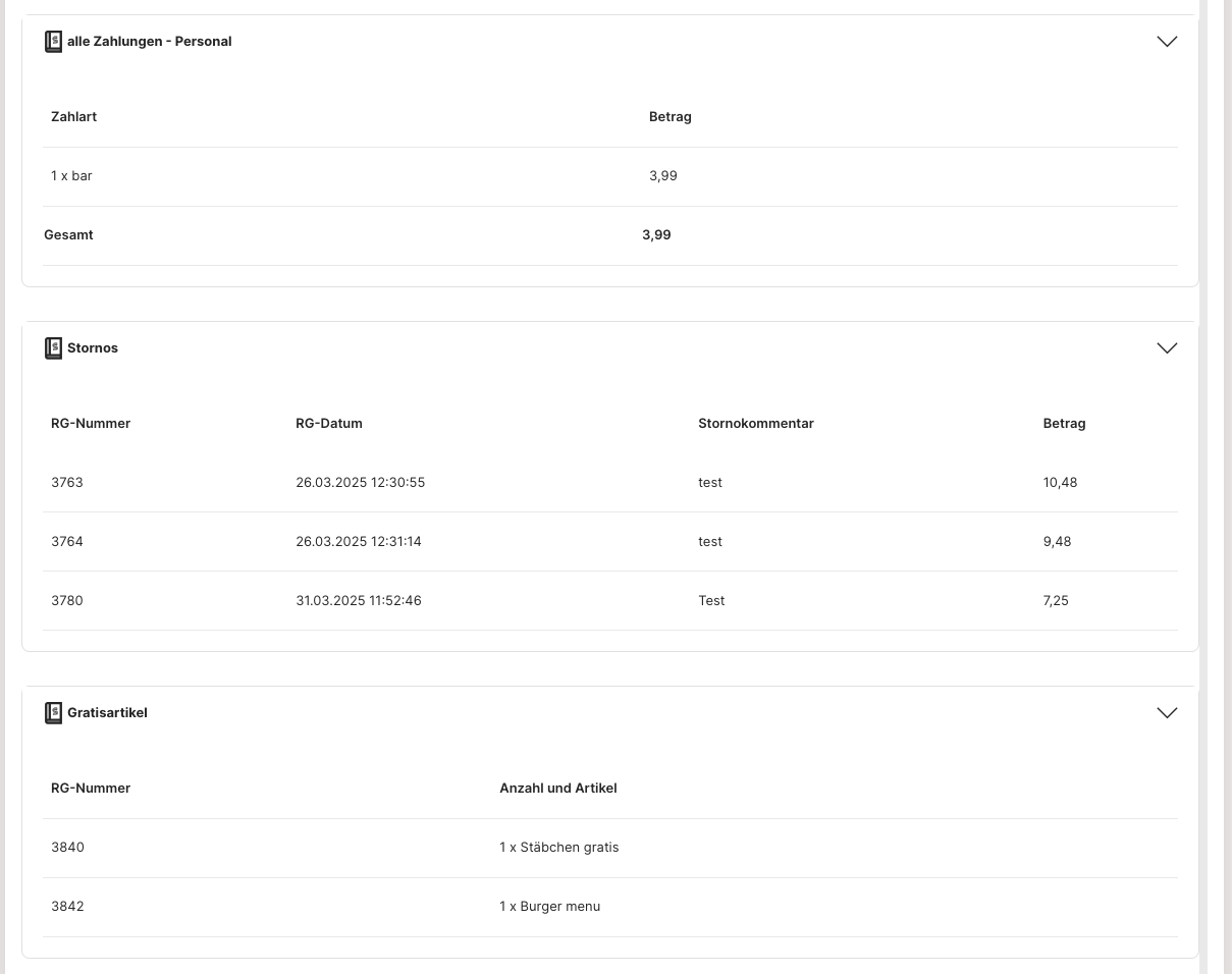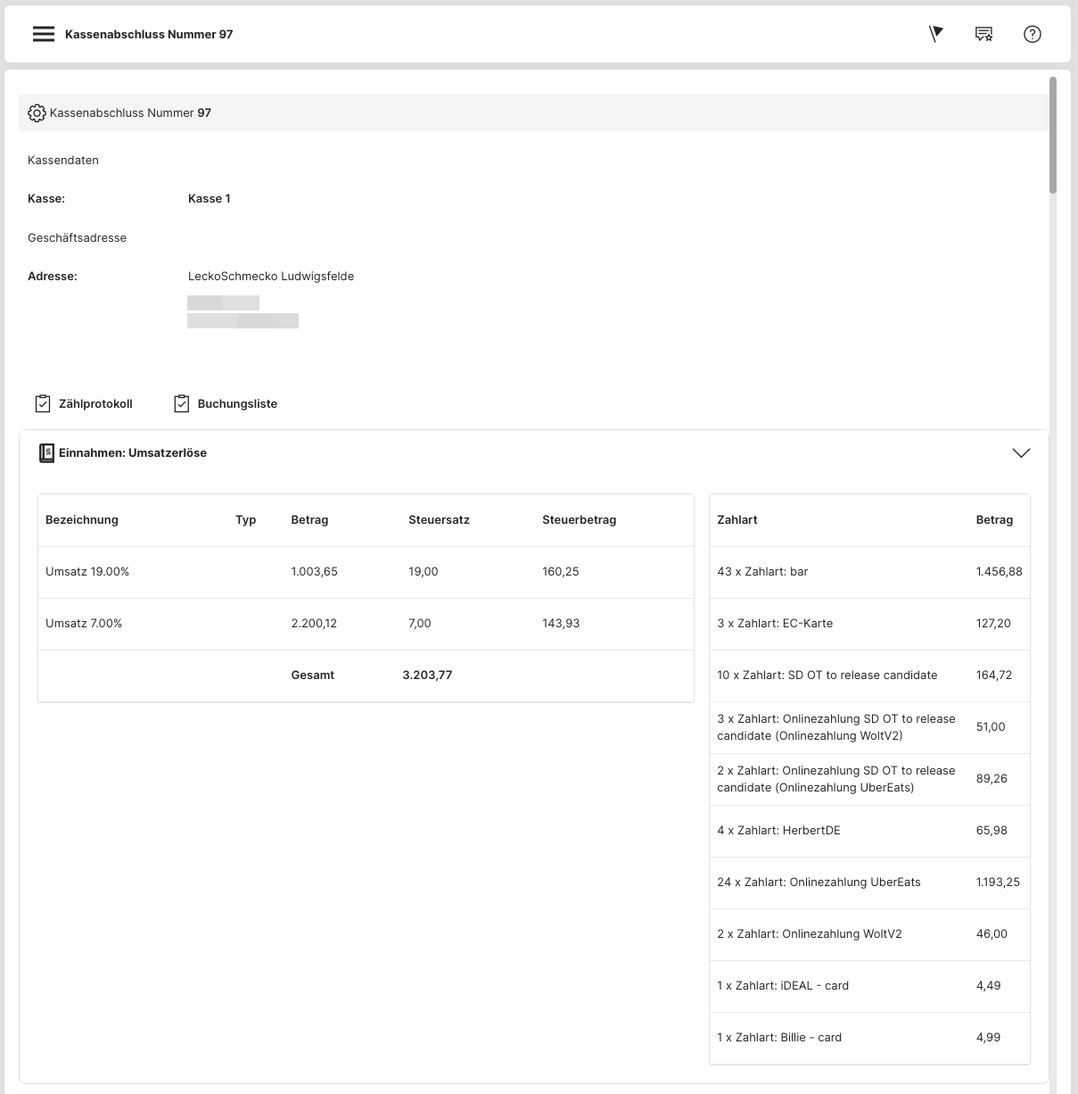 Im Punkt „Kassenabschlüsse“ hast du eine Auflistung aller gemachter Kassenabschlüsse im gewählten Zeitraum. Beim Klick auf die Lupe erhältst du eine Detailansicht des Kassenabschlusses. Du kannst dir das Zählprotokoll ansehen sowie die Buchungslisten einsehen. Des Weiteren kannst du den Kassenabschluss noch einmal auf A4 oder als Bon ausdrucken. Wenn du wieder in der Übersicht bist, dann kannst du auch von dort aus drucken.