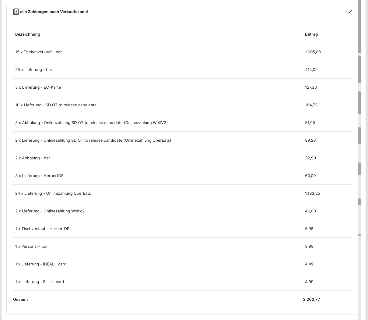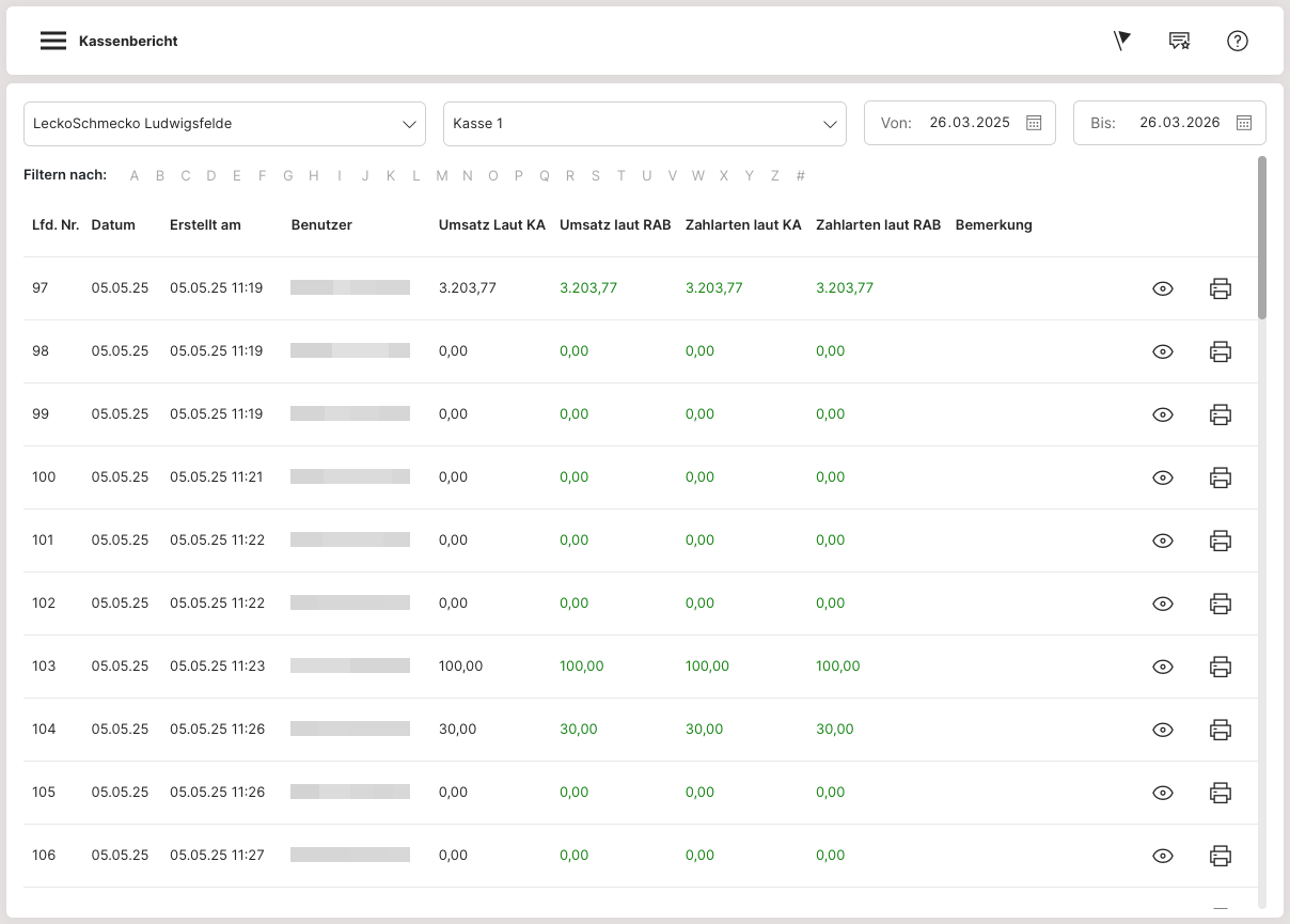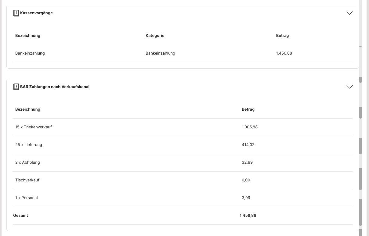 Im Punkt „Kassenabschlüsse“ hast du eine Auflistung aller gemachter Kassenabschlüsse im gewählten Zeitraum. Beim Klick auf die Lupe erhältst du eine Detailansicht des Kassenabschlusses. Du kannst dir das Zählprotokoll ansehen sowie die Buchungslisten einsehen. Des Weiteren kannst du den Kassenabschluss noch einmal auf A4 oder als Bon ausdrucken. Wenn du wieder in der Übersicht bist, dann kannst du auch von dort aus drucken.