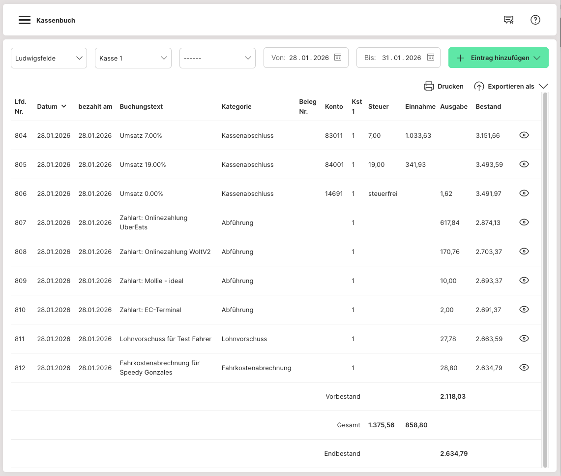 Im Kassenbuch sind alle Einnahmen und Ausgaben, die hinterlegt wurden, sowie die Kassenabschlüsse.
