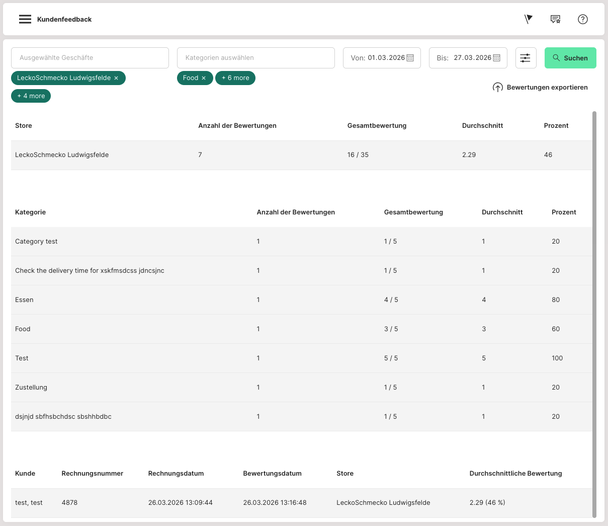 Hier kann man die Bewertungen einsehen, die Kunden abgegeben haben. Dazu muss man zuerst alle Einstellungen aus dem Artikel "Kundenfeedback Kategorien" vorgenommen haben.