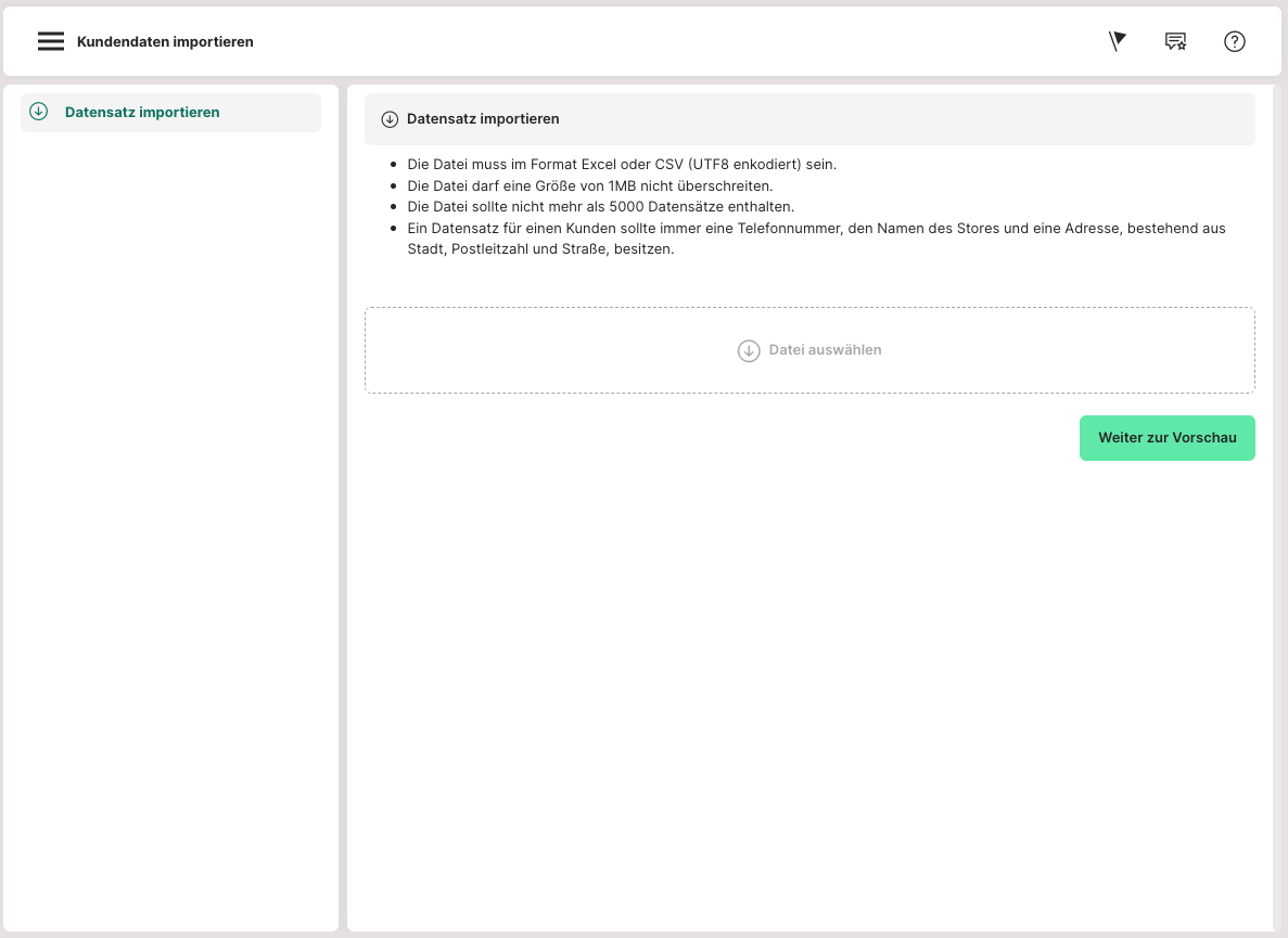 Pro Datei sollten nicht mehr als 5.000 Datensätze enthalten sein. Dies stellt sicher, dass der Import effizient bleibt und keine Performanceprobleme auftreten.