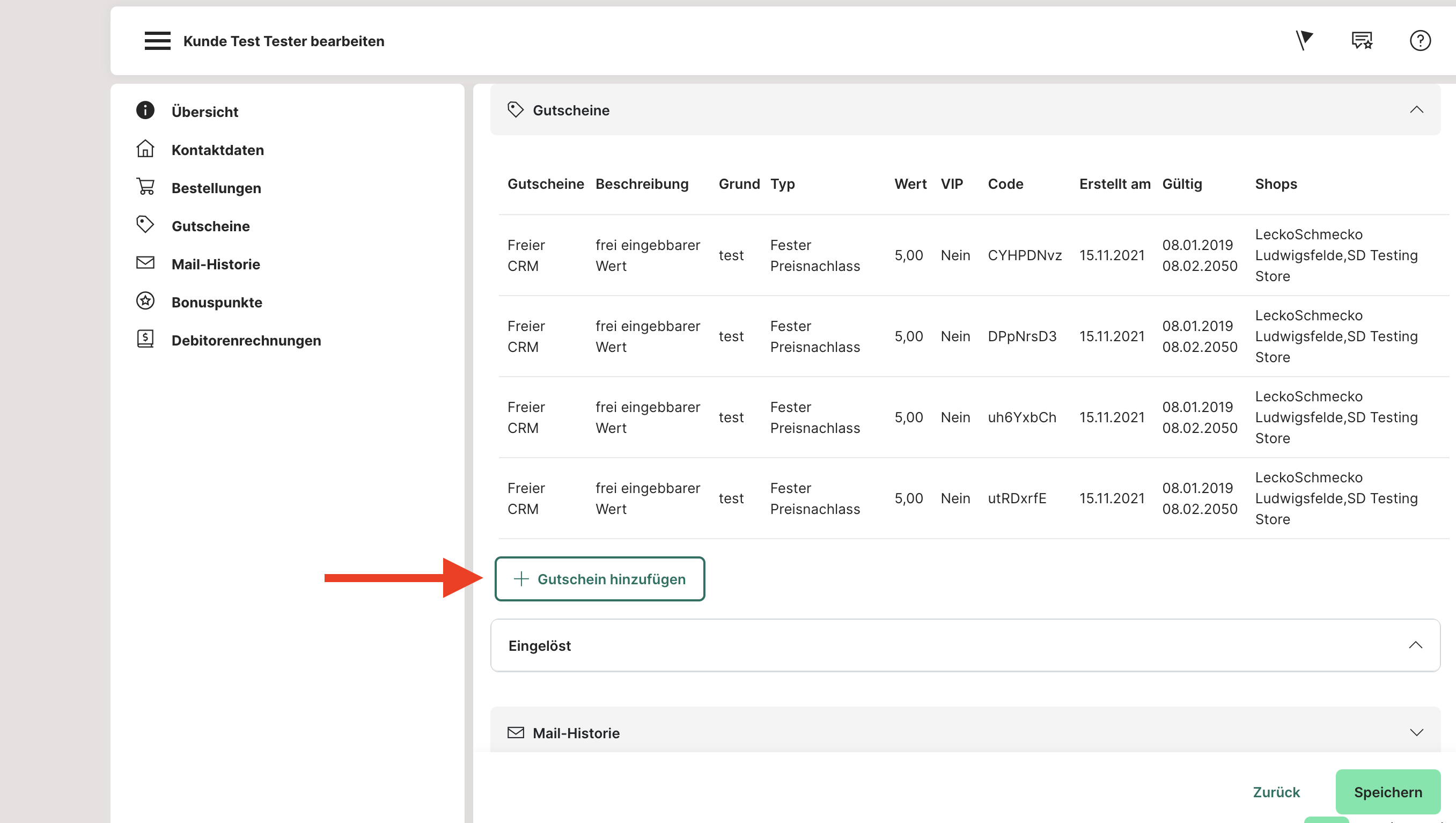 In dieser Ansicht bekommst du eine Übersicht über die vergebenen Rabatte (CRM) eines Kunden. Außerdem kannst du weitere Rabatte hinzufügen. Über das Drop-down-Menü unterhalb der aktuellen Gutscheine kannst du auch schon eingelöste Gutscheine sehen. Dies ist bspw. hilfreich, um bei Beschwerden sicherstellen zu können, dass Gutscheine bereits eingelöst worden sind.
