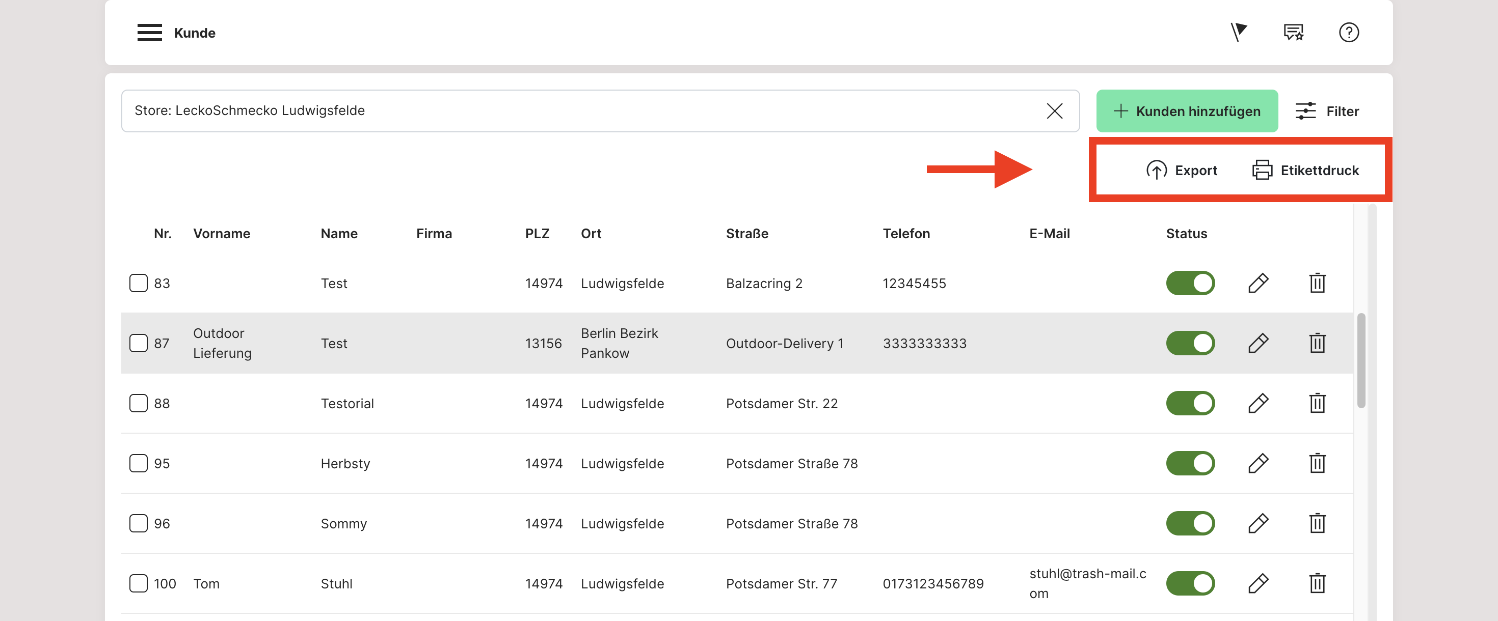 Nachdem du die Kundendaten gefiltert hast, kannst du diese als Excel-Dateien exportieren oder Adressaufkleber für einen Ausdruck generieren. Auf den Ausdruck kannst du einen Rabattcode hinterlegen, der mit aufgedruckt wird.