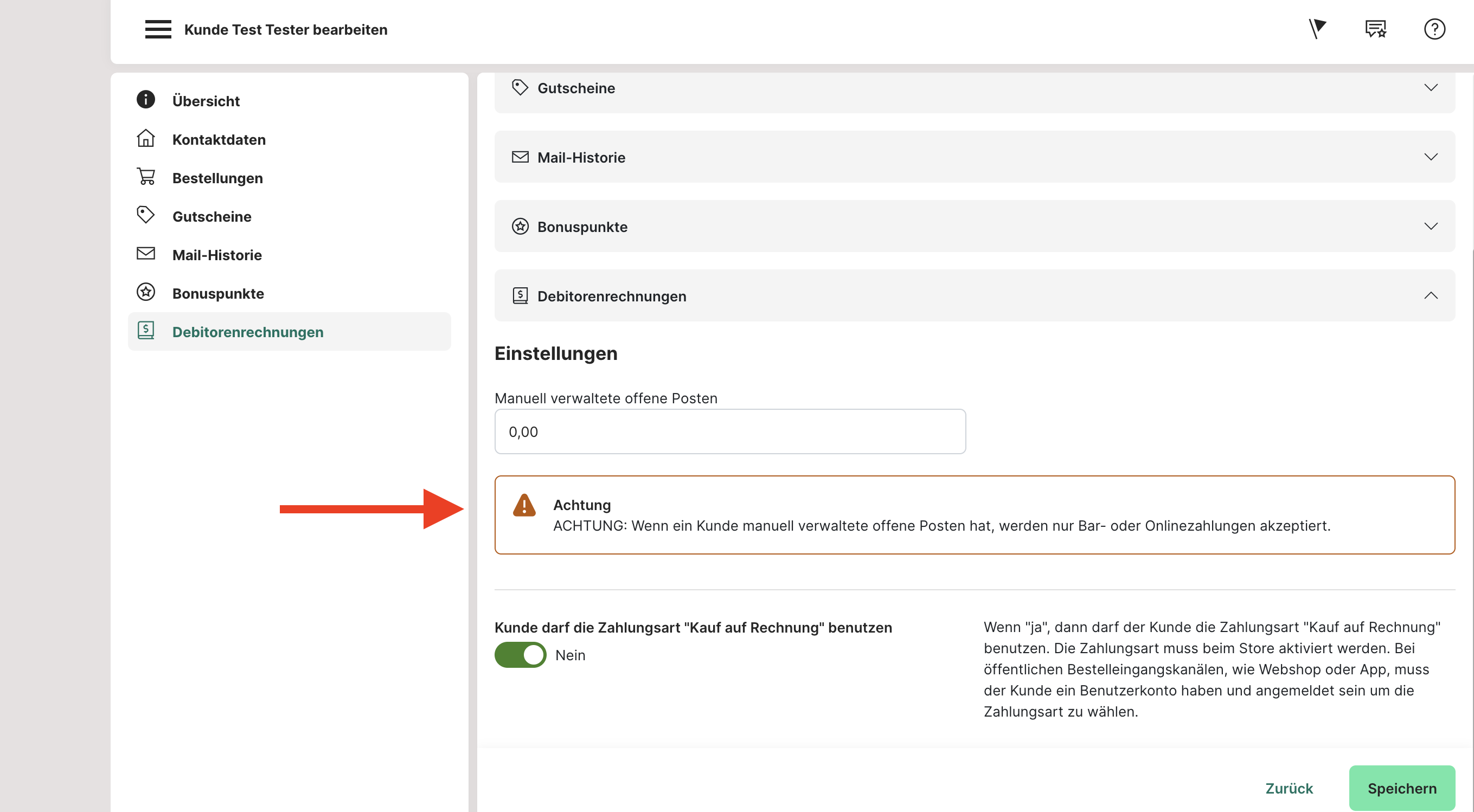 Sobald der Kunde eine Bestellung mit dieser Zahlungsart abschließt, wird er in der Kundenliste in roter Schrift angezeigt, genauso wie wenn er gesperrt ist oder man in diesem Reiter einen Wert für manuell verwaltete offene Posten oben einträgt.