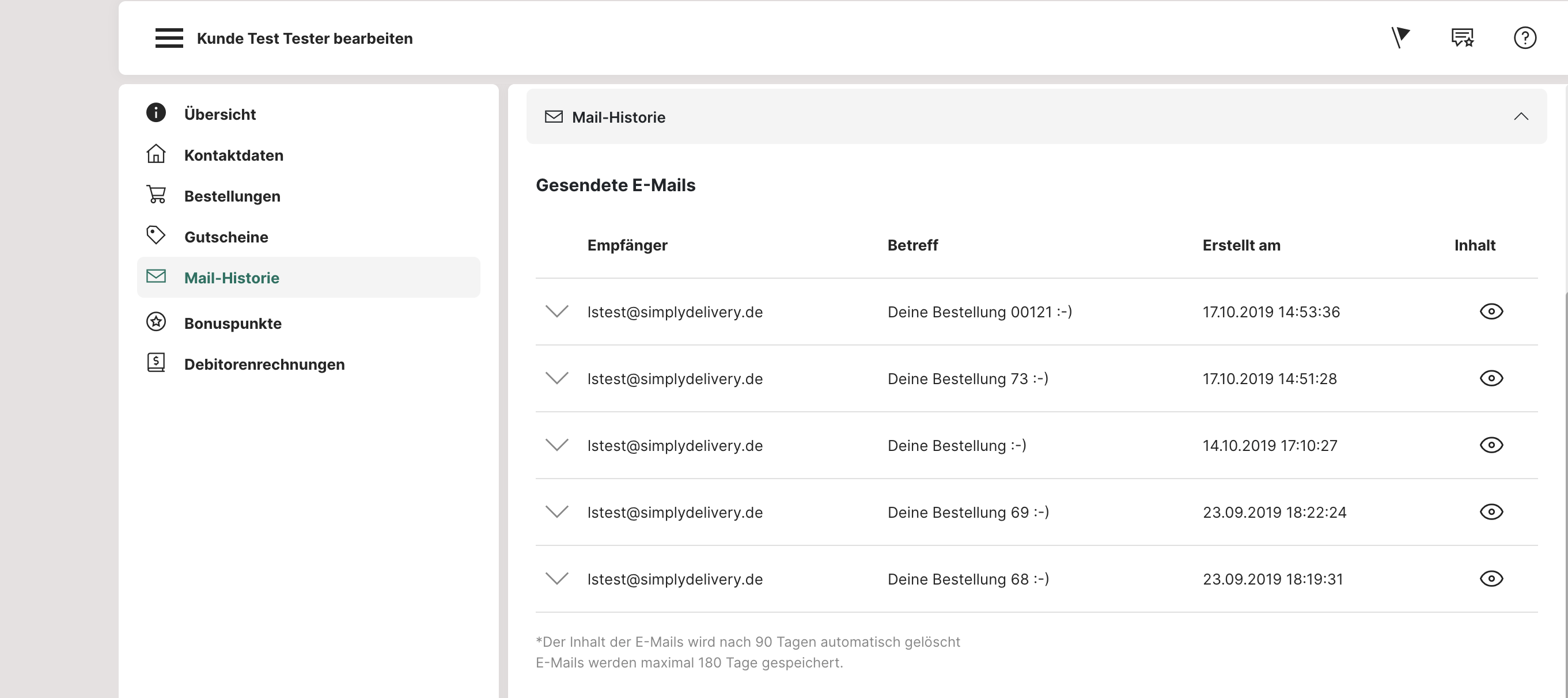 In der E-Mail-Übersicht werden alle E-Mails registriert, die automatisch an einen Kunden versendet wurden. So kannst du prüfen, ob z. B. Beschwerderabatte oder Bestellbestätigungen verschickt wurden.