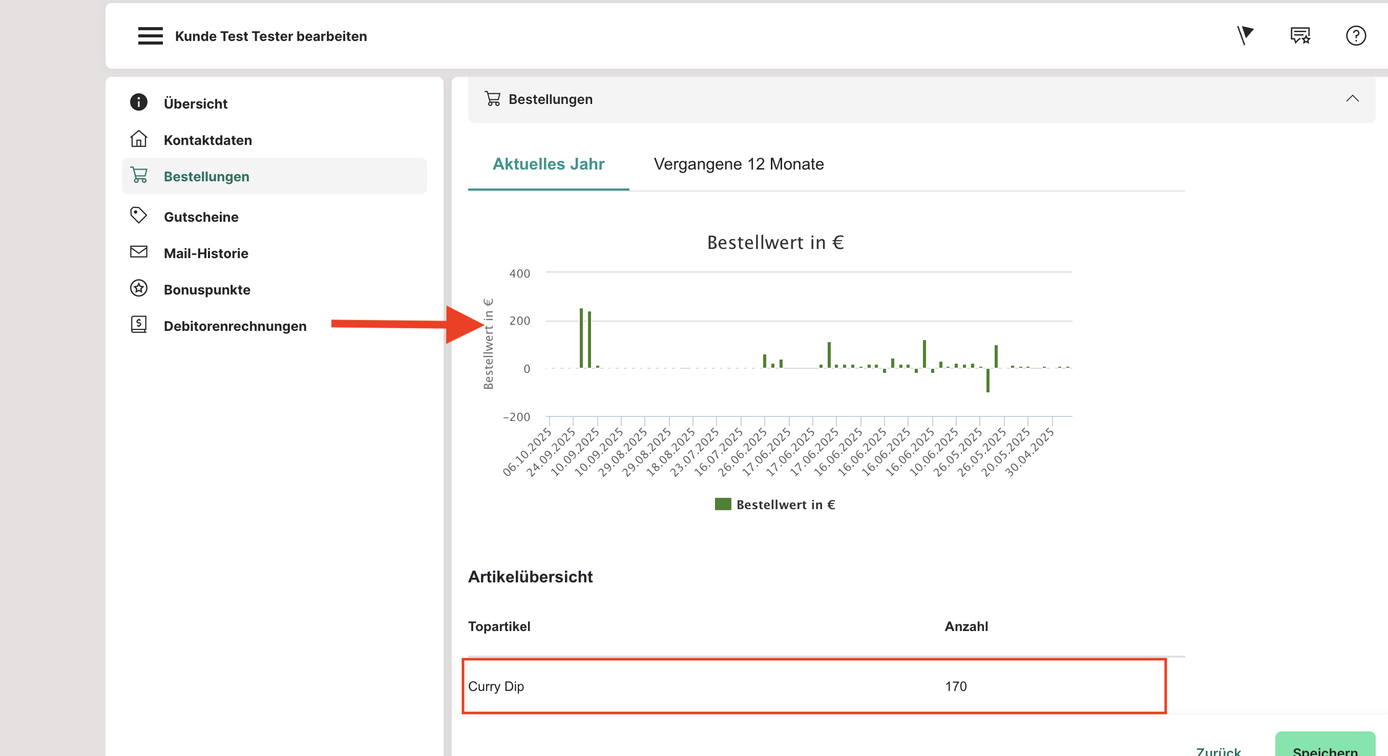 Hier erhältst du eine Übersicht über die Bestellungen, die der Kunde in der Vergangenheit getätigt hat. Du kannst in der Ansicht zwischen der gesamten Historie, dem aktuellen Jahr und der letzten 12 Monate wählen. Ebenfalls findest du auch eine Übersicht der Top 5 Artikel, die der Kunde in der Vergangenheit bestellt hat. Das ist bspw. hilfreich, wenn du einem Stammkunden einen Gutschein mit einem Gratis-Artikel zusenden oder bei ihm hinterlegen willst.