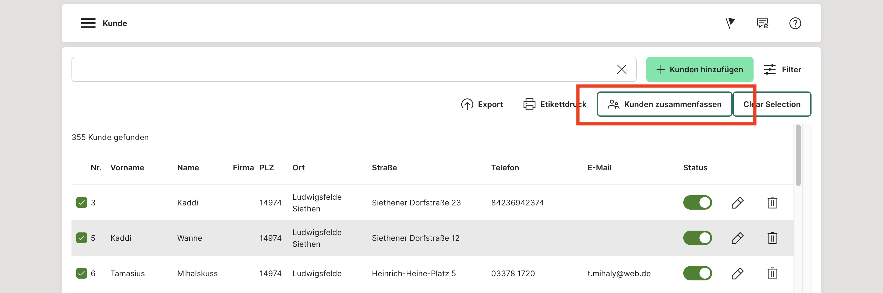 Über die das Anklicken Checkboxen neben den Kundenlisteneinträgen in der Hauptübersicht, welche nur bei bestimmten Kunden erscheinen, kannst du diese anwählen. Nachdem 2 oder mehr Kunden auf diese Weise angewählt wurden, erscheint oben rechts am Anfang der Seite unter der Liste der orange Button „KUNDEN ZUSAMMENFASSEN". Hast du den Button für die Zusammenführung betätigt, kannst du in einer Übersicht zwischen den beiden Konten wählen, welches übernommen werden soll. Dies kannst du z. B. abhängig von der Kundennummer, die am Ende bestehen bleiben soll, entscheiden. Im nächsten Feld kann dann entschieden werden, welche Adressen übernommen werden sollen und welche der Adressen die Standardadresse sein soll. Im dritten und letzten Feld kannst du noch entscheiden, welche Telefonnummern und Mailadressen übernommen werden sollen.