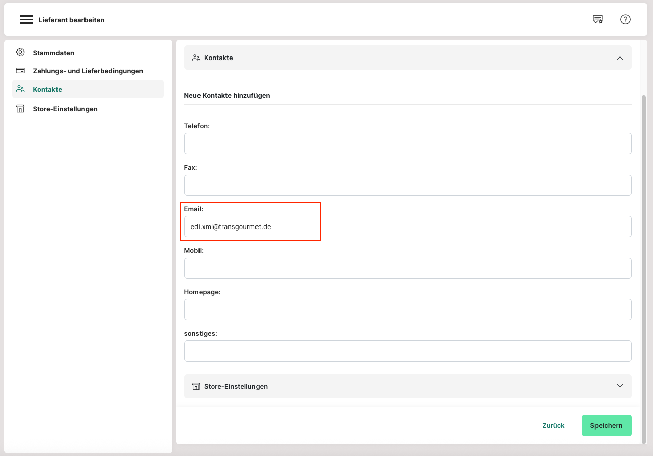 Für Transgourmet hinterlege hier bitte folgende E-Mail-Adresse: edi.xml@transgourmet.de . Denke bitte daran, dass für eine problemlose Übermittlung der Bestellungen ebenfalls im Abschnitt "Stammdaten" das Format "openTrans-XML" eingestellt werden muss.
