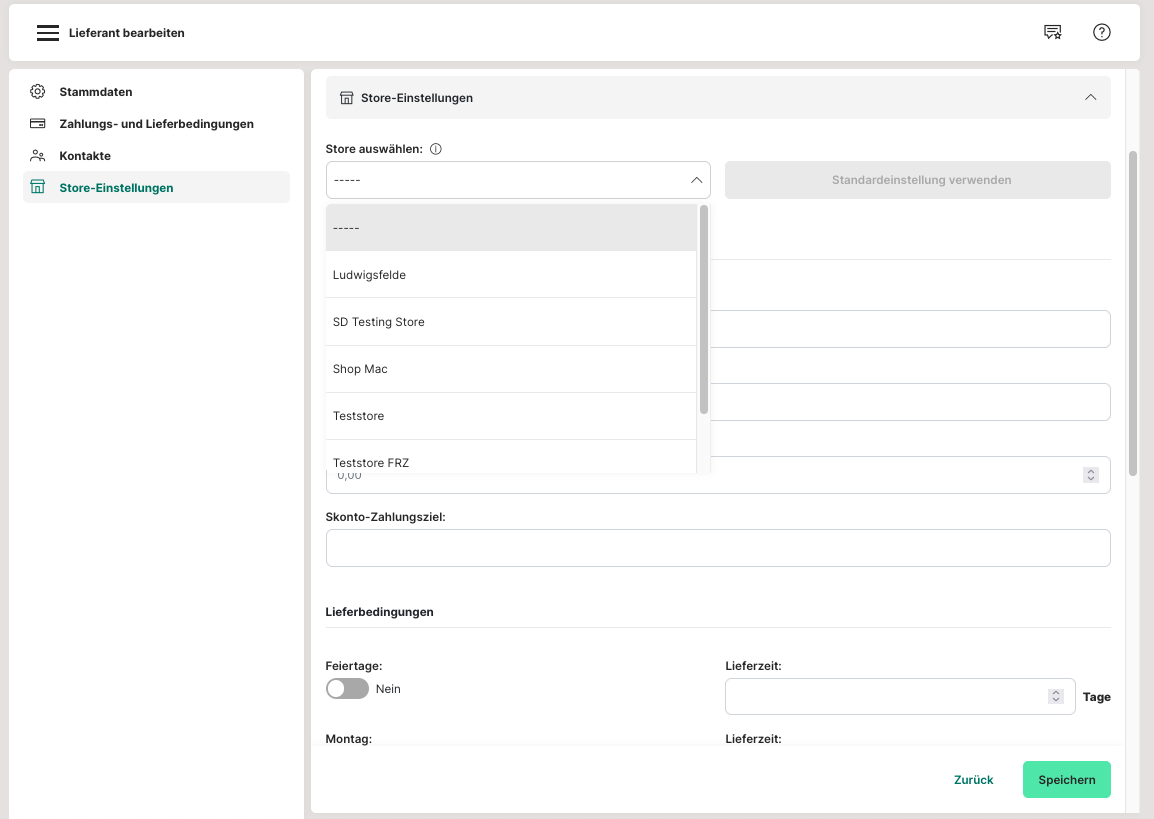 Store-Einstellungen: Wenn du über mehr als einen Store verfügst, dann kannst du individuelle Liefer- und Skontodaten hinterlegen. Dazu müssen jedoch die Standardeinstellungen im Abschnitt "Zahlungs- und Lieferbedingungen" angelegt sein. Wähle aus dem Dropdown einen Store aus und gib die Daten ein. Klicke zum Abschluss "Speichern". Ebenso kann hier die elektronische Übermittlung aktiviert werden.