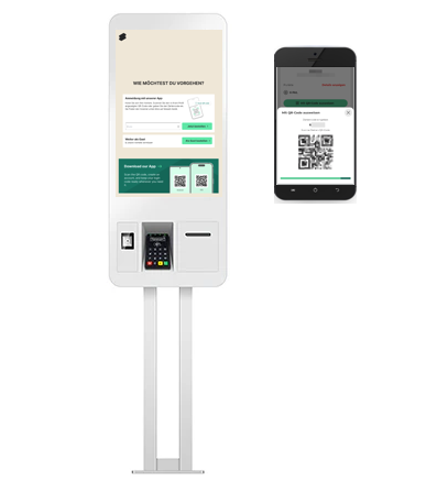5. Scanne den QR-Code auf dem Scanner des Selbstbedienungsterminals oder gib den Zahlencode ein, um dich am Selbstbedienungsterminal anzumelden.